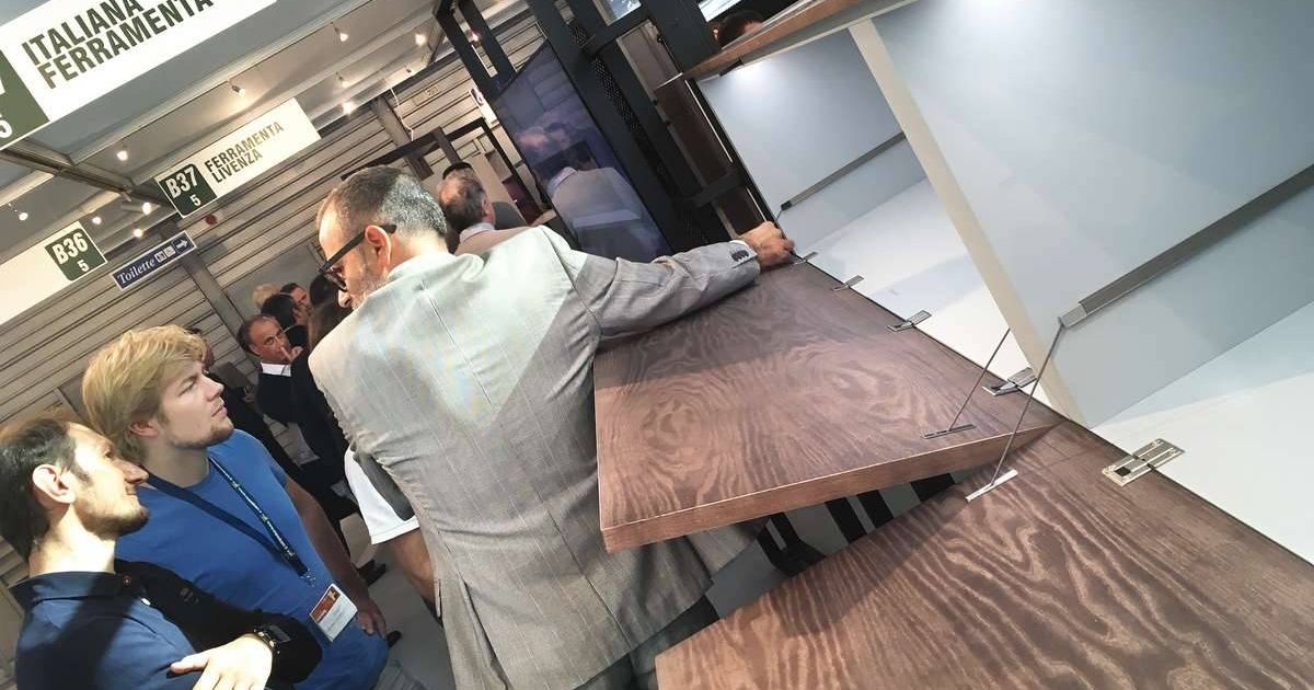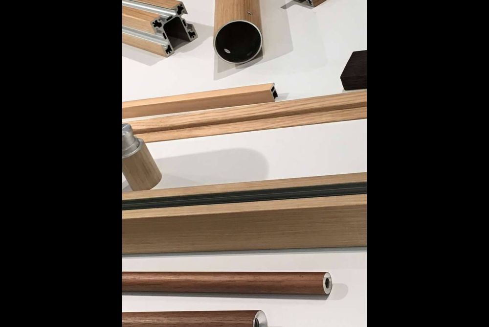 Der Hersteller von Möbelkomponenten Fiam präsentierte eine besondere Kompetenz: die Ummantelung von Aluminiumprofilen mit Furnier. Dadurch sind Konstruktionen und Verbindungen möglich, die aus Holz oder Holzwerkstoffen nur schwer zu realisieren wären. Neben der eigenen Kollektion des Tochterunternehmens agiert der Zulieferer auch als Partner für andere Möbelproduzenten.