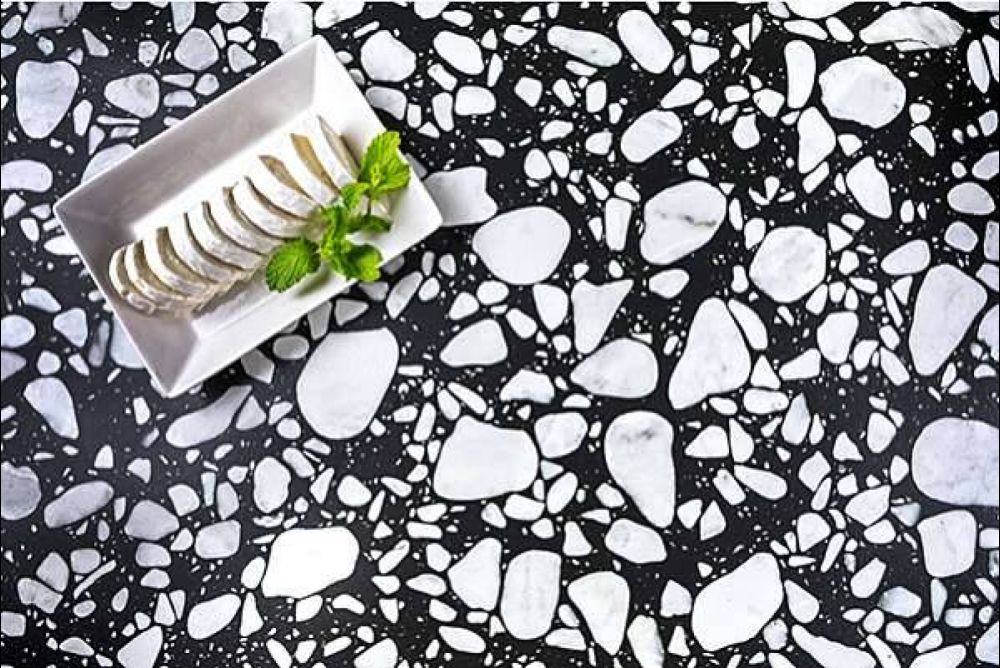 Neue Designs für das kommende Jahr zeigte der Hersteller keramischer, mit spezieller Sintertechnik hergestellten «Neolith»-Platten. Eine Besonderheit: Die Produkte das spanischen Unternehmens sind durchgängig gleich im Erscheinungsbild, sodass die Keramik auch an der Kante mit identischer Optik punktet. Die Platten werden bis zu einer Grösse von 3200 × 1500 Millimetern und einer Stärke von 12 Millimetern hergestellt. Einsatzgebiete sind Küchen- und Bademöbelabdeckungen, Waschtische, Wannen- oder Duscheneinfassungen und Bodenbeläge oder Wandverkleidungen im Innen- und Aussenbereich. Neue, interessante Designs sind neben Beton- und Metallvarianten auch die Terrazzo-Nachbildung «Venice Midnight» sowie die Steindesigns «Mont Blanc» oder «Mar de Plata».