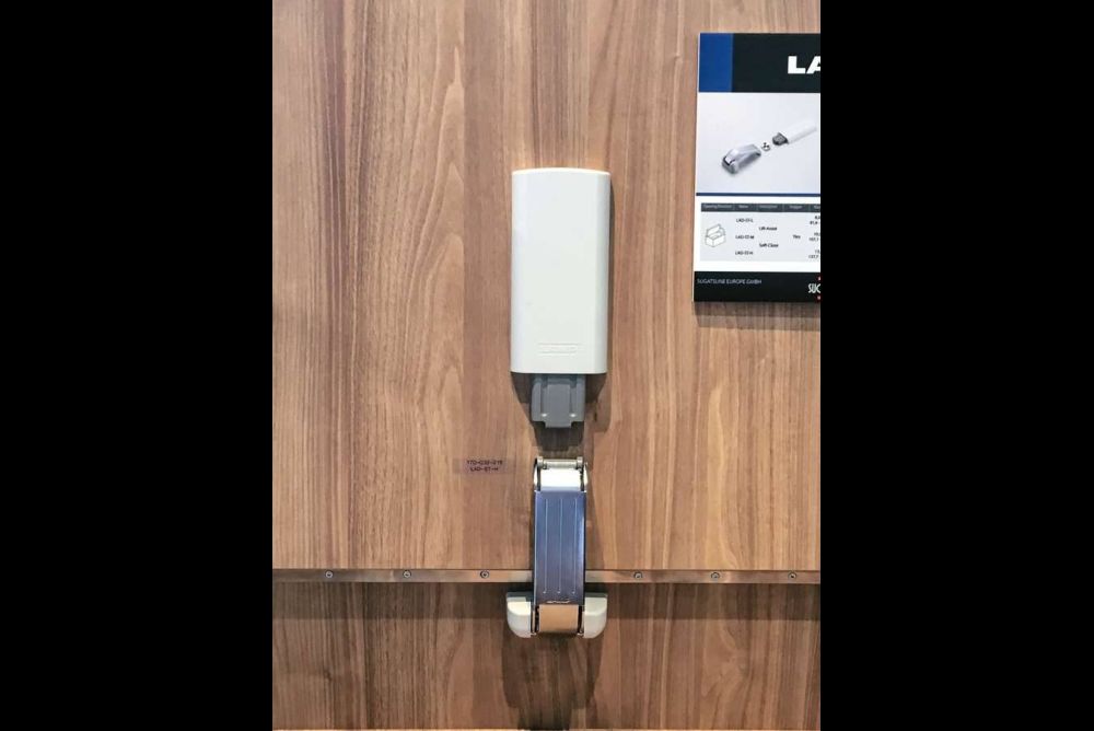 Als ein Star für die Messebesucher entpuppte sich der Seilklappenbeschlag «Kiaro» von Italiana Ferramenta. Im Gegen- satz zu den Modellen anderer Hersteller ist «Kiaro» dieser im Inneren des Korpusses nur durch eine auffallend unauffällige, weil schmale Abdeckung zu sehen. Links wie rechts verwendbar, soll der Beschlag auch für schwere Möbelklappen einsetzbar sein. Ermöglicht wird die Schlankheit, weil die Technik mit Dämpfer in einem dünnen Gehäuse hinter der Rückwand am Korpus untergebracht ist. Deshalb läuft die Führung bis an die Rückwand, wo das Seil mittels Bohrung und Hülse durch die Rückwand durchgeführt wird. Die Einstellung des Öffnungswinkels erfolgt von innen. Optional soll «Kiaro» auch mit einer integrierten LED-Beleuchtung erhältlich sein.