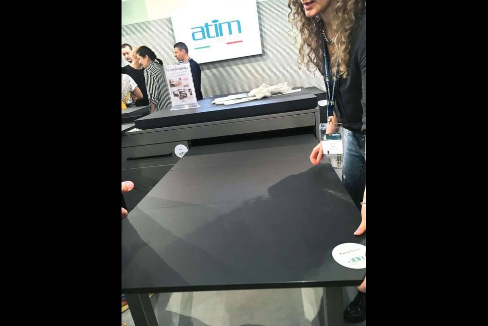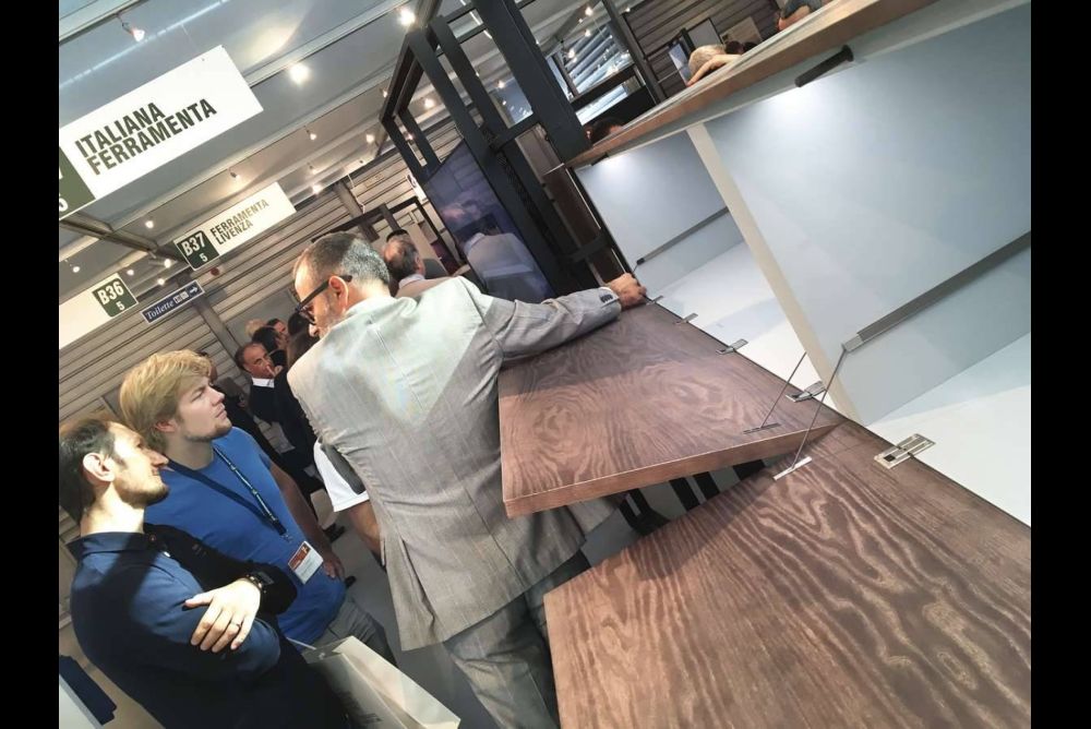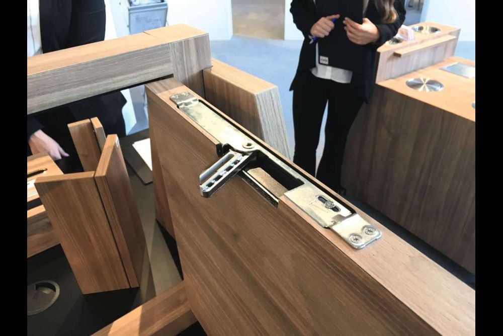 Die Messebesucher schieben eifrig hin und her, drehen und rütteln an dem wie von Geisterhand geführten Ausziehelement. Zwischendurch gehen die Betrachter auf Tauchstation. Sehen kann man beim Blick unter die Platte jedoch kaum etwas. Dennoch lässt sich mit dem neuen Beschlag «Sestante» die Aufdoppelung einer Abdeckung zweidimensional ausziehen und gleichzeitig x-beliebig fächerhaft drehen. Bei begrenztem Raum schafft der Beschlag so ein Gefühl von räumlicher Grosszügigkeit mit Überraschungseffekt. Das Ganze ist aber nur eine Neuheit von Atim aus Mailand. Das Unternehmen hat gleich mehrere neue Beschläge für die Wandlungsfähigkeit von Möbeln gezeigt, darunter auch erstaunlich lange Ausziehtischbeschläge, die bei Nichtgebrauch komplett hinter dem Schubkastendoppel verschwinden. Ausgezogen bietet dieser im Handumdrehen einen gebrauchsfähigen Tisch. Dort, wo er bei der normalen Küchenarbeit stören würde. Dazu sind die Standbeine auch mit integriert, die sich zum Verstauen einklappen lassen.