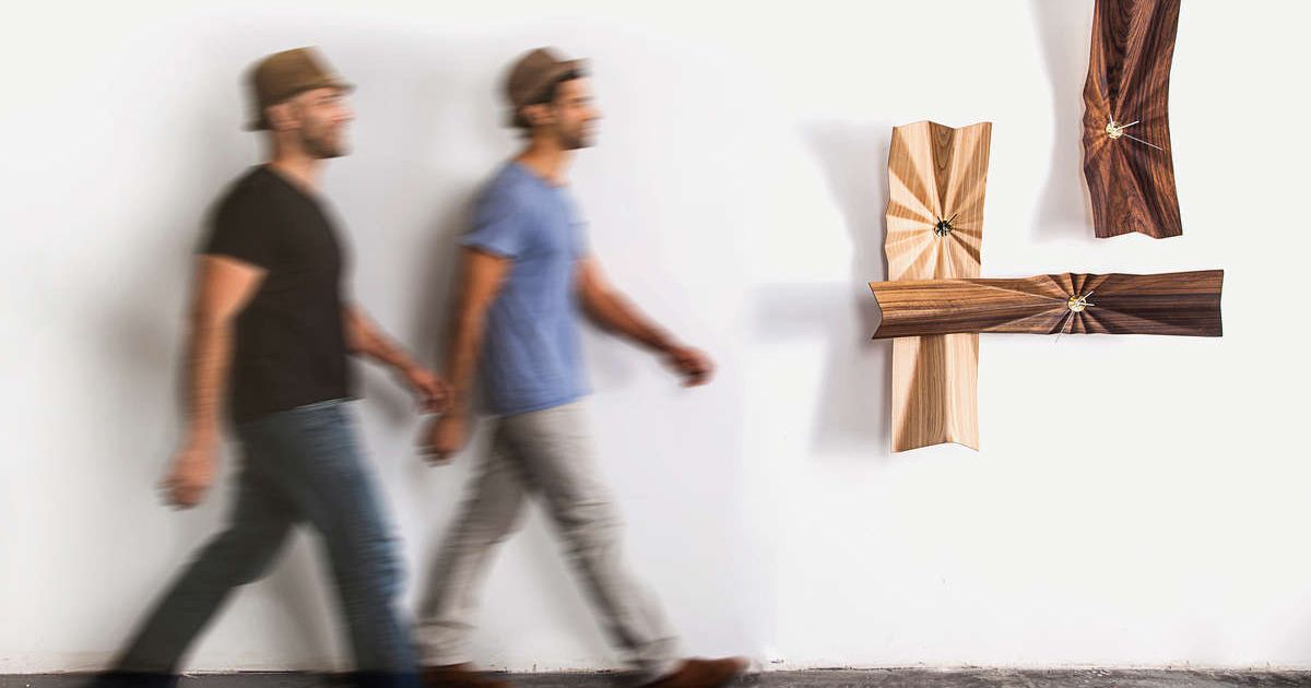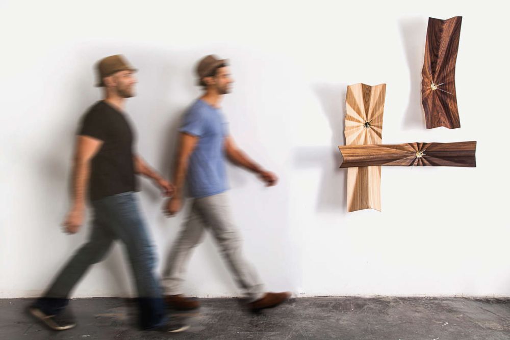 An Superman vorbei konnte man im Superstudio Piu etwa das israelische Industrie-Designer-Duo «Cozi» finden. Aus aussergewöhnlich stark verformtem Furnierholz sind die Lampenschirme, Schalen und jetzt auch Uhren gefertigt, so dass diese fast wie geknittert wirken. Die Herstellung mit einer grossen Presse und zweischaliger Schablone ist an sich nichts Neues. Mit der 3D-Druck-Technik für die Schablonenherstellung des formfolgenden Ansatzstückes liegt man auf der Höhe der Zeit.