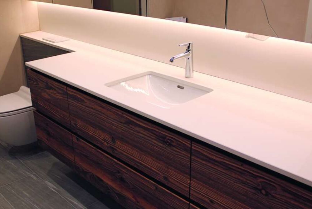 Staron, Corian, Hi-Macs und ähnliche Mineralwerkstoffe bestehen meist zu zwei Dritteln aus einem natürlichen Mineral und zu einem Drittel aus Acrylharz. Das Endprodukt ist unempfindlich gegenüber Feuchtigkeit und Säure. Die Bearbeitung gelingt problemlos mit Hartmetallwerkzeug, und mit dem passenden Klebestoff entstehen fugenlose Verbindungen. Die Oberfläche der Mineralwerkstoffe hat keine Poren und ist somit hygienisch und leicht zu reinigen. Allerdings gilt es bei der Kombination mit Holzwerkstoffen, auf das unterschiedliche Schwind- und Quellverhalten zu achten. Während Holz hauptsächlich auf die relative Luftfeuchtigkeit reagiert, ist bei den Mineralwerkstoffen die Temperatur für Dimensionsveränderungen ausschlaggebend. Darauf ist auf Verklebungen zu achten. Sonst können schnell Spannungsrisse entstehen.