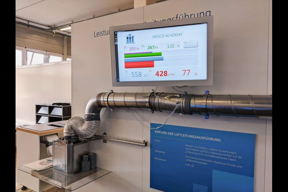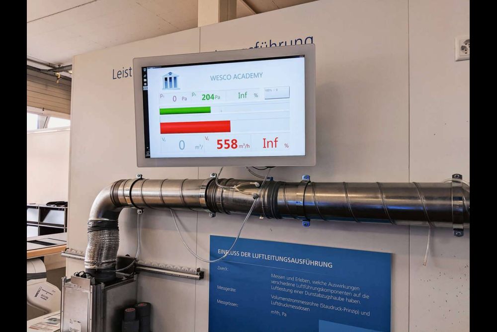 Leitungen, Klappen und Mauerkästen sind entscheidende Komponenten für einen effizienten Dunstabzug. Experten stellen immer wieder fest, dass Fehler in diesem Bereich zu Problemen mit der Absaugleistung führen. «Bögen, Reduktionen und Wettergitter haben immer einen Einfluss auf die Absaugleistung», sagt Andreas Liechti. Er ist Leiter der Academy von Wesco, wo Architekten, Planer und Monteure in Sachen Küchenlüftung geschult werden. Mithilfe von Tabellen, die von den Herstellern oder auch vom Verband Küche Schweiz zur Verfügung gestellt werden, lässt sich errechnen, wie gross der Widerstand in einer Leitung ausfällt. Dieser Wert wird in Pascal (Pa) angegeben und zeigt auf, wie gross der Druckverlust in der Leitung ist. Fügt man diese Werte zusammen mit der Leistungskurve des Dunstabzugs in ein Diagramm ein, ergibt sich am Schnittpunkt der maximale Betriebspunkt. Das bedeutet, dass an diesem Punkt der vom Ventilator erzeugte Zusatzdruck den Druckverlust durch das Rohrnetz exakt ausgleicht. Hier ist die maximale Luftfördermenge in einer Anlage erreicht.