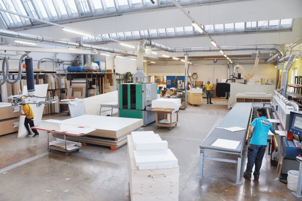 Beim Bearbeitungszentrum (BAZ) kam dies ebenfalls vor: Die Schreinerei wollte eine 5-Achs-Maschine. Aber bereits bei den Begriffen gab es hier unterschiedliche Auffassungen: Die einen offerierten ein Modell, dessen fünfte Achse nur eine Stellachse war. «Unsere Forderung war aber eine «echte» 5-Achs, bei der man alle Achsen interpolierend einsetzen kann», sagt Duss. Ausserdem stellte das Unternehmen fest, dass für ihre Produktion die Verfahrgeschwindigkeit nicht sehr entscheidend ist. Ein platzsparendes BAZ mit eingeschränkter Geschwindigkeit, das ohne Trittmatten auskommt, war also durchaus denkbar.