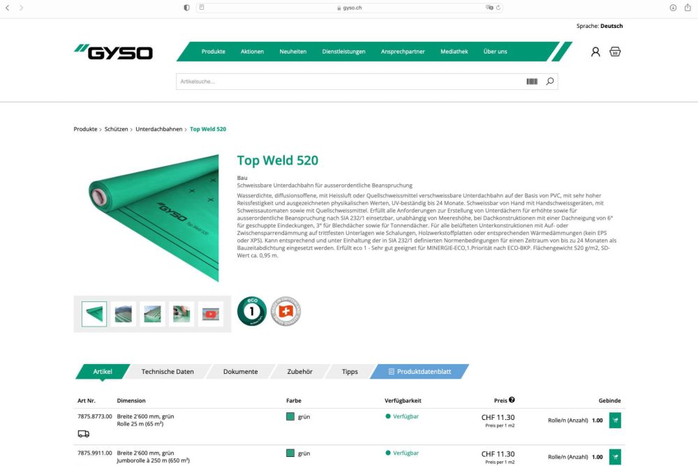 Webshop der Woche. Der Kleb- und Dichtstoffanbieter Gyso setzt voll auf den Handel im Internetshop. Bereits mehr als 50 Prozent der Bestellungen kommen online rein. Und derzeit ist man daran, den Auftritt den neusten Bedürfnissen anzupassen.