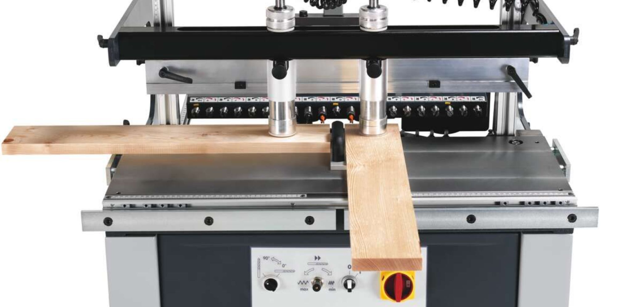 Diese Maschinen in einem Wort zu definieren, ist aber nicht ganz einfach, da die Hersteller verschiedene Bezeichnungen verwenden. So finden sich beispielsweise Begriffe wie Universal- oder Multi-Dübelbohrmaschine, Dübellochbohrmaschine, Dübelautomat, Bohrautomat oder auch semiautomatischer Bohrautomat. Auch wenn die Bezeichnungen verwirrend sein können, arbeiten die Maschinen meistens nach demselben Prinzip. Je nach Grösse und Ausführung kommen bis zu 35 Bohrer zum Einsatz. Das Bohraggregat lässt sich um 90° schwenken, was sowohl flächige als auch stirnseitige Bohrungen ermöglicht.