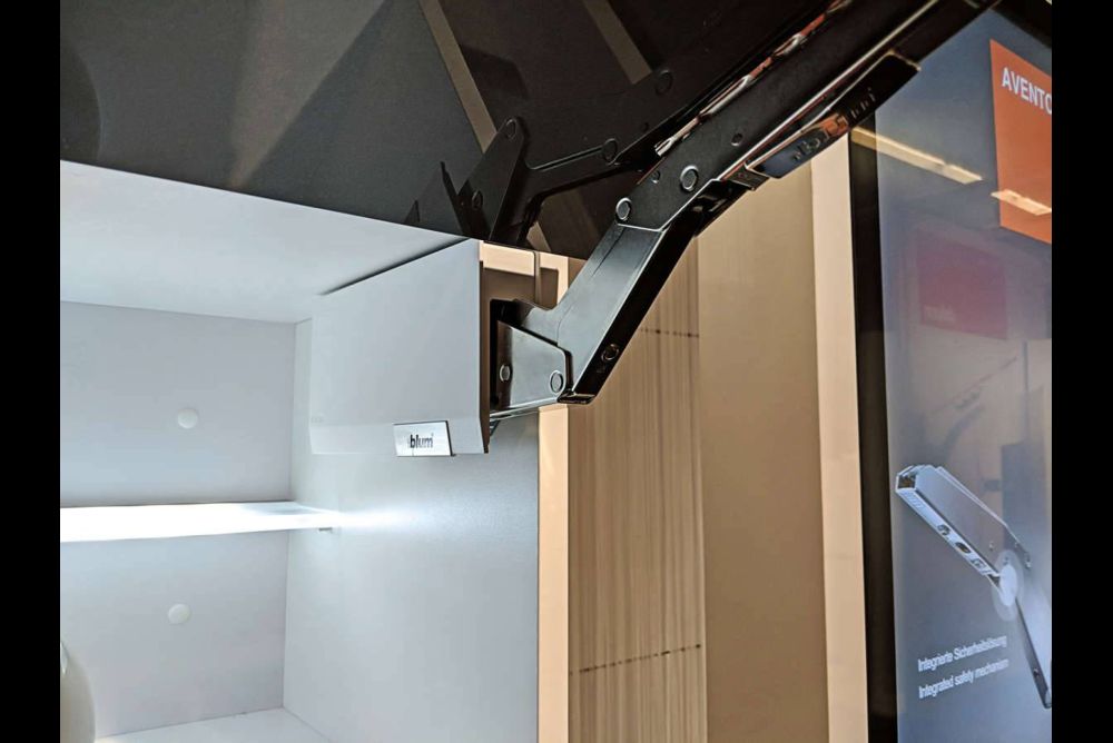 Wesentlich kompakter und eleganter fällt der überarbeitete Klappenbeschlag «Aventos» von Blum aus. Das Frontgewicht lässt sich bei geöffneter Klappe nun wesentlich bequemer von vorne mit einer Torx-schraube einstellen. Ausserdem wurde auch eine Sicherung eingebaut, die verhindert, dass der Beschlag bei ausgehängter Front schlagartig ausfährt. Die Sicherung wird deaktiviert, sobald man die Front einhängt.