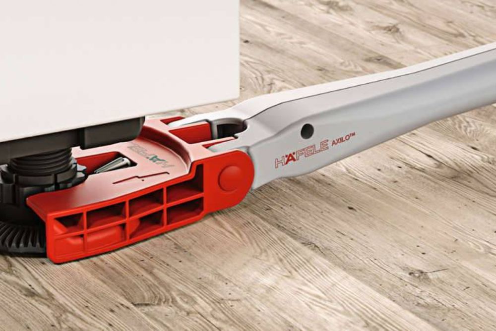 Mit dem neuen Sockelverstellsystem «Axilo» von Häfele gelingt die Korpusnivellierung mit wenigen Handgriffen. Das Verstellwerkzeug dient als verlängerter Arm. Kein Bücken, kein Kriechen, kein Strecken mehr – mit der Verlängerung erreicht man bequem auch die hinteren Sockelfüsse, sogar jene von Eckunterschränken.