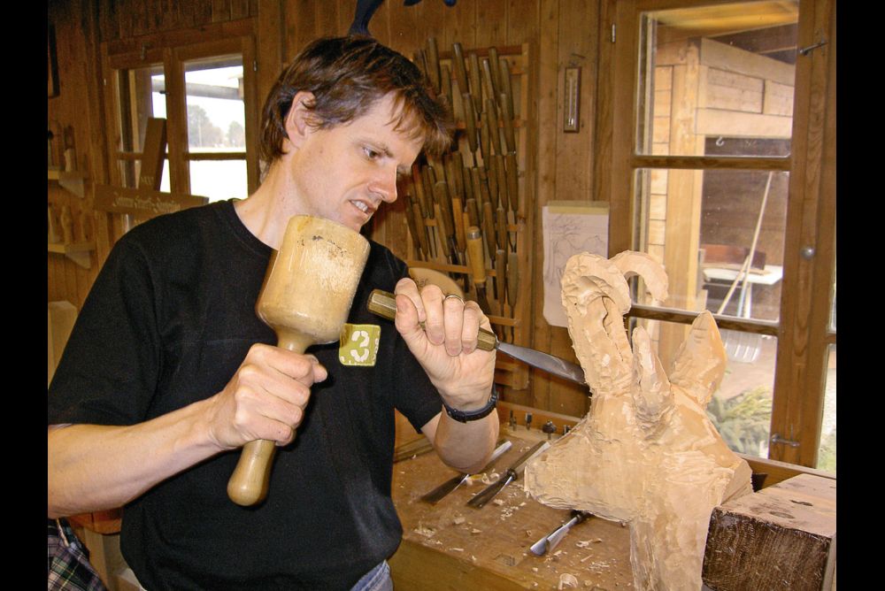 Er sollte sicherlich aus Hartholz sein. Die Holzart spielt aber nicht so eine Rolle. In meiner Karriere als Bildhauer habe ich erst wenige Holzhämmer ver- braucht. Man kann Birnbaum nehmen, Apfel oder Esche …