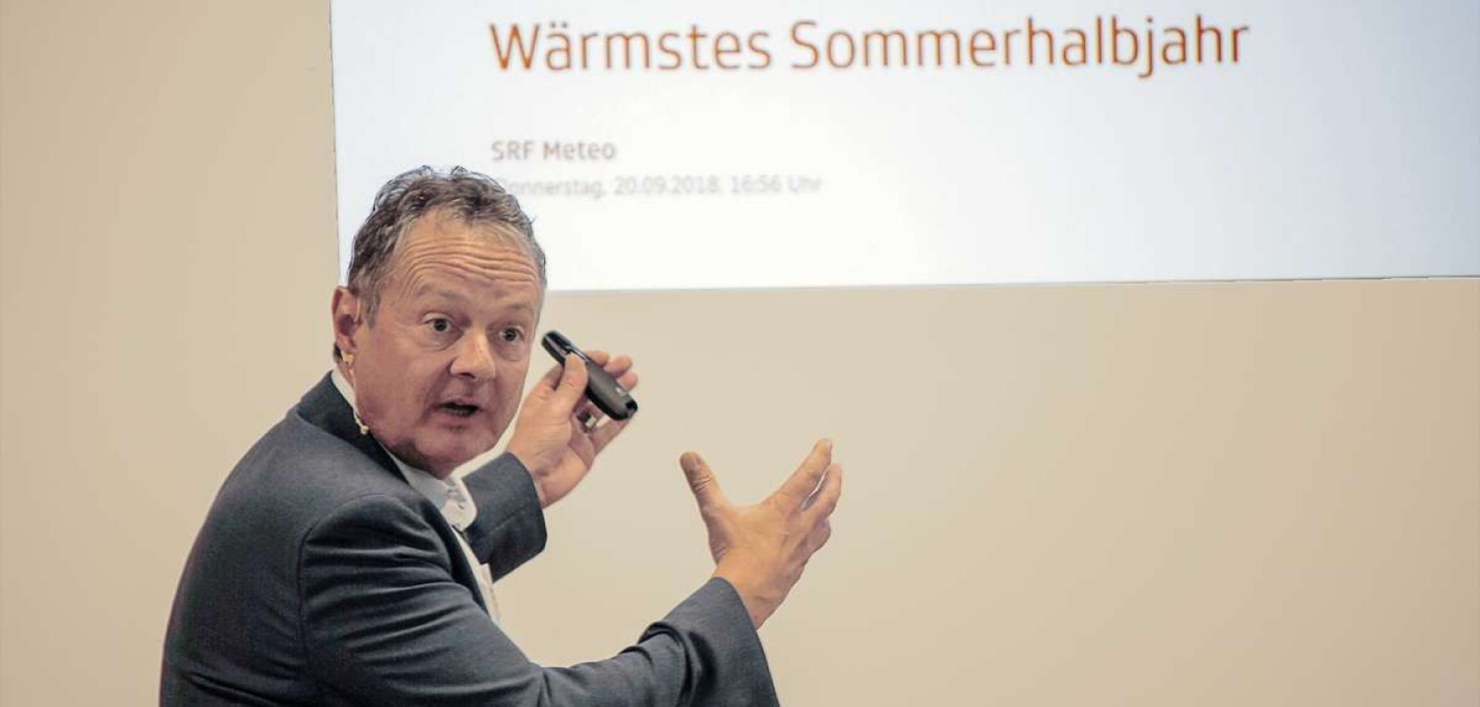 SRF-Meteorologe Thomas Bucheli hielt ein Referat über das Klima, das aus der Balance gerät. Bild: Holzindustrie Schweiz