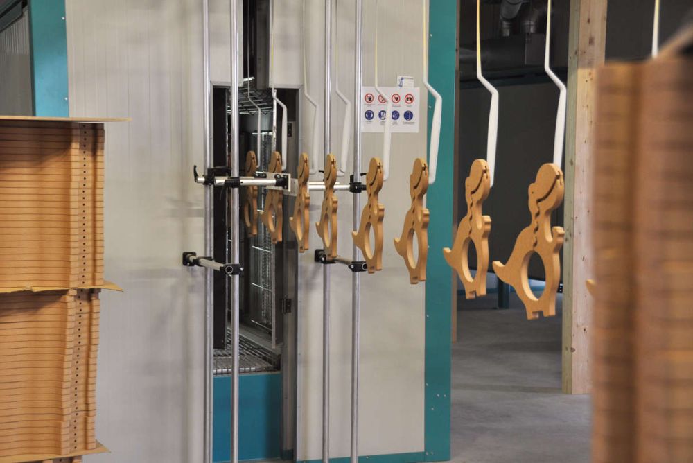 Von den Kapazitäten her ist die Anlage so ausgelegt, dass täglich bis zu 400 Dinos fertig beschichtet werden können. Hagspiel ist aber auch im Gespräch mit Schreinereien, die vielleicht künftig Teile bei ihm beschichten lassen wollen. Ausserdem ist man laufend dabei, mit neuen Werkstoffen, Farben und Oberflächenstrukturen zu experimentieren. Hendrik Albers stellt klar, dass man bei der Pulvertechnik im Holzbereich nach wie vor am Anfang der Entwicklung stehe. «Im Nasslackbereich ging das ja auch nicht von heute auf morgen. Da hat man über hunderte von Jahren Erfahrungen gesammelt.»