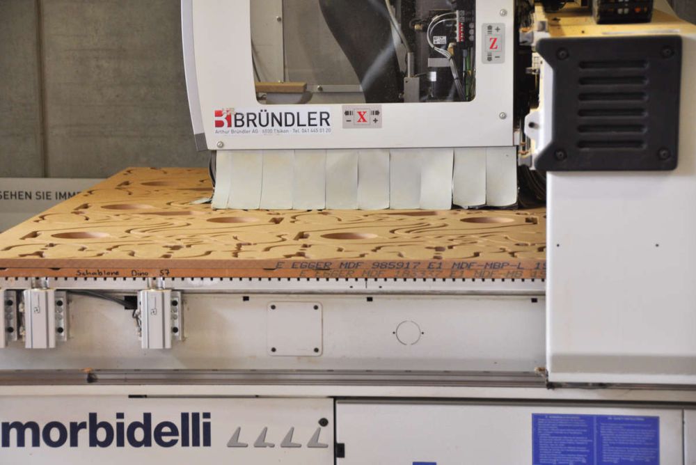 Solche Aspekte spielten aber bei den Dinos von René Hagspiel weniger eine Rolle. Die Teile werden auf einer Nesting-Maschine aus ganzen MDF-Platten in einer Aufspannung gefräst. Ziel war es, dass die Dinos direkt nach der Bearbeitung ohne Schleifarbeit mit dem Zweischichtsystem beschichtet werden können. Das bedingt natürlich eine perfekte CNC-Bearbeitung sämtlicher Kanten, Rundungen und Ausschnitte. «Beim Zweischichtsystem hat man zudem den Vorteil, dass Fehlstellen nach dem Grundieren bei der visuellen Kontrolle sofort auffallen», sagt Hagspiel.