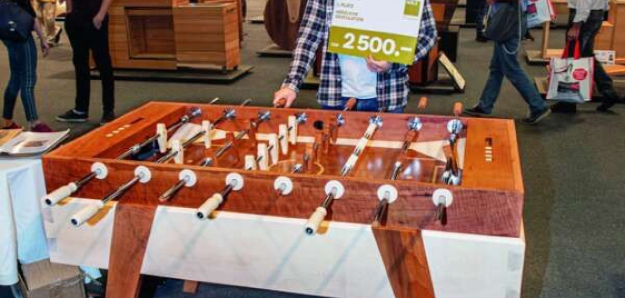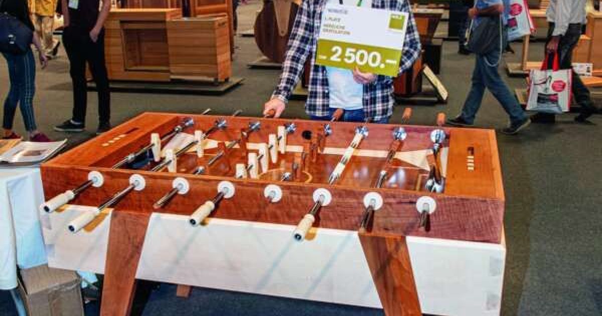 Nachwuchsstar. Der Töggelikasten von Dino Hediger hat das Publikum bei der letzten Messe begeistert. Der Schwyzer wurde zum «Schreiner Nachwuchsstar 2019» gewählt. Zu seiner Überraschung hat das gute Stück noch keine Abnützungserscheinungen.