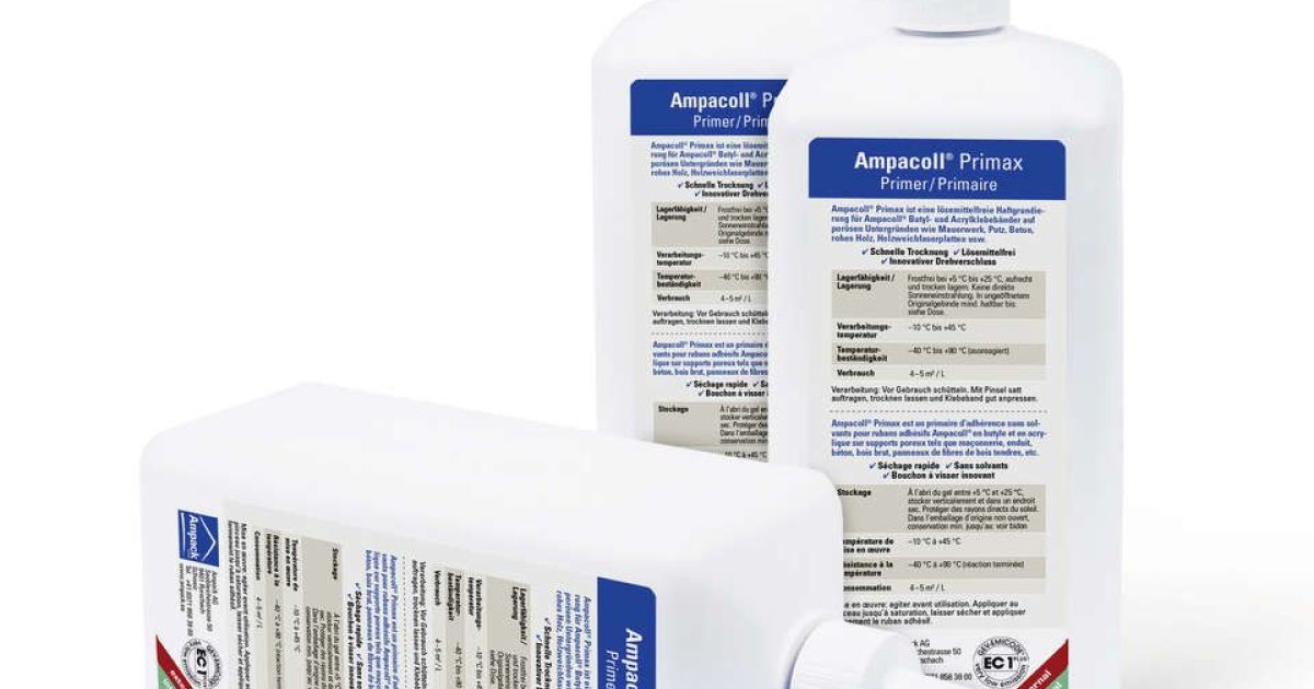 Der neue Primer von Ampack basiert auf einem lösemittelfreien Acryl-Copolymer und lässt sich optimal auf porösen und saugenden Untergründen wie Mauerwerk, Putz, Beton, rohem Holz oder Holzweichfaserplatten auftragen. Er dringt in den Untergrund ein und verfestigt ihn. Auch nach dem Trocknen bleibt der Primer dauerklebrig, sodass die passenden «Ampacoll Butyl- und Acrylklebebänder» optimal haften können. Seine Temperaturbeständigkeit von –40 °C bis +90 °C sorgt für eine langlebige Verbindung. Ein breiter Arbeitstemperaturbereich von –10 °C bis +45 °C ermöglicht das Primern bei fast jedem Wetter. Die Trocknungszeiten sind auch noch bei 0 °C mit 45 Minuten gering. Der geruchsneutrale Primer besitzt das «EC1-Plus-Label» und lässt sich innen und aussen einsetzen.
