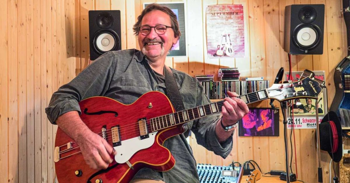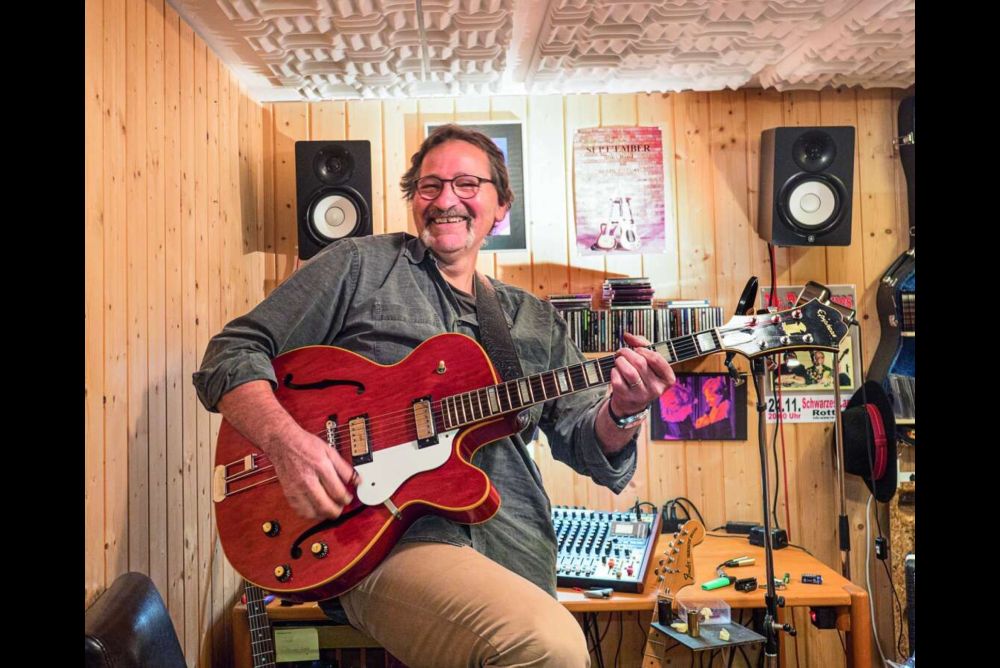 Federt August Schmid die Kellertreppe hinunter, kann es gefährlich werden. Gefährlich lange. Gut möglich, dass er erst um zwei Uhr in der Früh wieder auftaucht – erschöpft, ausgepowert, aber zufrieden. Denn im Kellergeschoss seines Eigenheimes in Frauenfeld TG hat er sich sein «Rüümli» eingerichtet, und das hat mit Fitness nichts und mit Musik sehr viel zu tun. Da hängen die «Klampfen», wie «Guscht» seine Gitarren liebevoll nennt, an der Wand, da stehen Boxen, da ist ein Verstärker, ein Notenständer, Notenblätter. Die isolierte Decke weist darauf hin, dass es hier nicht nur gefährlich lange, sondern gefährlich laut werden kann. «Eine Stunde pro Tag spiele ich mindestens», sagt der 60-Jährige, greift sich seine rote 66er Epiphone Broadway und legt los. Die Auftritte sind seit der Pandemie seltener geworden. «Früher konnten es über 60 im Jahr sein. Es war eine schöne Zeit, die mir viel gebracht hat», blickt er zurück und bringt die Saiten zum Schwingen. Früher, das war die Zeit, als er in Bands mitspielte, vom Thurgau jede Woche ins Sarganserland zum Proben fuhr, oft Wochenende für Wochenende auf einer Bühne stand. «Damals war die Musik quasi mein zweiter Job. Eine Zeit lang spielte ich mit dem Gedanken, damit den Lebensunterhalt zu verdienen.» Doch davon träumt der Oberflächenspezialist nicht mehr, zu gut kennt er die Gnadenlosigkeit des Musikbusiness. Heute tritt er vorwiegend an privaten Anlässen wie Geburtstagen oder Firmenfeiern auf, meistens solo mit Gitarre und «Schnorregiige».