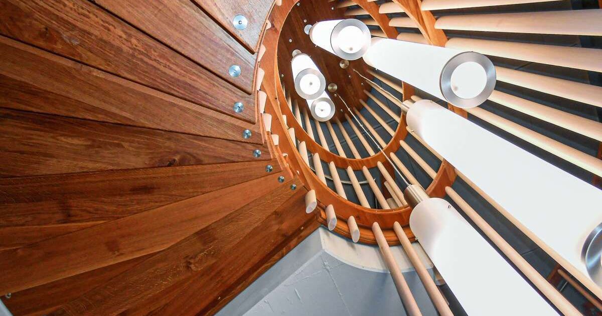 Die hängenden Ahornleisten sind im Treppenauge bis über 7000 mm lang. Bild: Roos Treppenbau AG