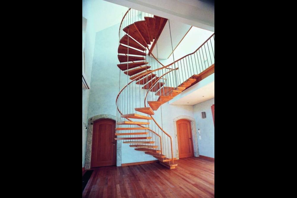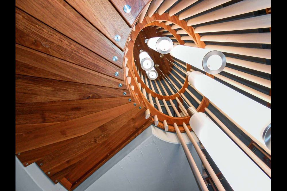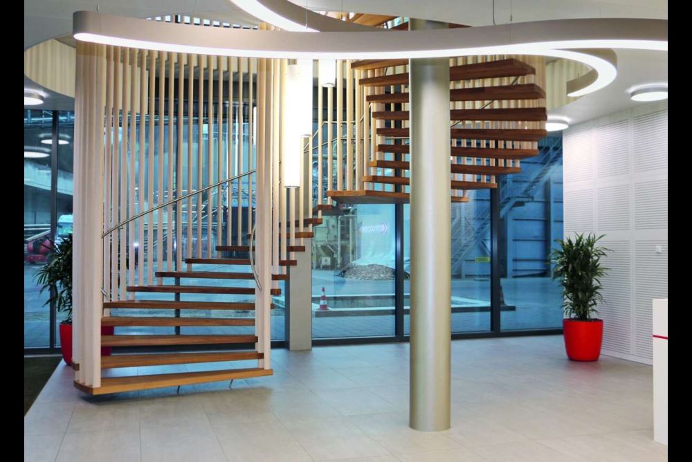 Die Wendeltreppe über zwei Stockwerke rechts im Bild ist in doppeltem Sinn eine hängende Treppe der Treppenbau.ch AG in Ganterschwil SG. Mit nur gerade fünf Stahlstangen wurde die Treppe in die Dachkonstruktion gehängt. Die Tritte wurden durch Hülsen miteinander verbunden und an den geschwungenen Handlauf gehängt, was den Bereich zwischen den Stangen tragfähig macht. Die Verbindung der Antrittsstufe mit dem Hallenboden wirkt hier den radialen Kräften entgegen.