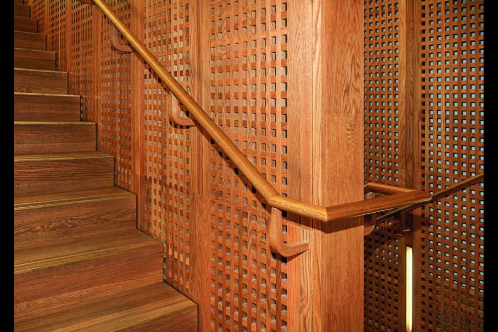 Die vielbegangene Treppe wurde für eine hohe Belastung konstruiert, sodass viele Personen sie gleichzeitig nutzen können. Damit beim Betreten der Antrittsstufe keine radialen Kräfte die langen Holzstäbe in Schwingungen versetzen, erhielt der unterste Tritt drei dezent angebrachte Verbindungsstützen zum Hallenboden.