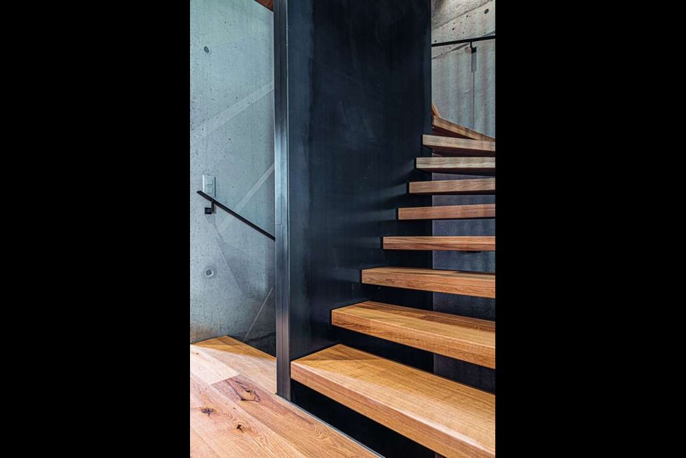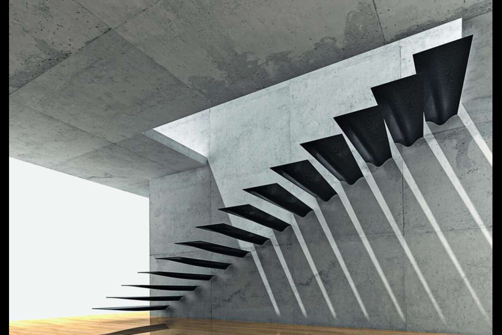 Nichts von ihrer Konstruktion zeigen auch Kragarmtreppen, deren Stufen aus der Betonwand zu wachsen scheinen. Normalerweise haben diese Stufen eine kubische Form und sind ziemlich dick – nicht nur damit der freie Zwischenraum unter 120 mm bleibt, sondern um eine kaum federnde Konstruktion zu erlauben. Mit einer Karbontreppe hat die CNC Holz Group SA diese schwebende Wirkung etwas auf die Spitze getrieben. Und die Erfahrungen zeigen, dass die funktionellen Anforderungen darunter nicht leiden. Mit Kohlenstofffasern und Epoxidharz wird jede Stufe in einer Muschelkonstruktion hergestellt, in der auch alle Anschlusselemente mit eingebunden sind.