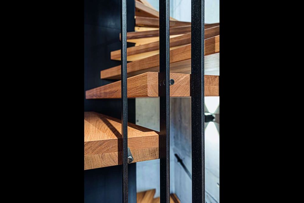 Die Herausforderung lag vor allem auf der offenen Raumseite. Dort wurden über die gesamten, offenen Bereiche vertikale Flachstahlbänder aus Schwarzstahl aufgehängt und daran die Stufen mit Bolzen verschraubt. Die Stahlkonstruktionen selbst wurden verschweisst, damit sie keinerlei Spiel wie beispielsweise bei Verschraubungen aufweisen. Durch die Länge der durchlaufenden Flacheisen musste auch einiges vor Ort geschweisst und nachbehandelt werden. Damit der Trittschall nicht direkt durch die an der Stahlkonstruktion befestigten Tritte auf die Betonwände übertragen wird, mussten alle Anschlüsse so konstruiert werden, dass man sie schalldämmend lagern konnte. Wichtig war dem Treppenbauer, dass die Komplexität der Anschlusstechnik nicht sichtbar ist und somit das ruhige Bild der gesamten Treppe nicht beeinträchtigt wird.
