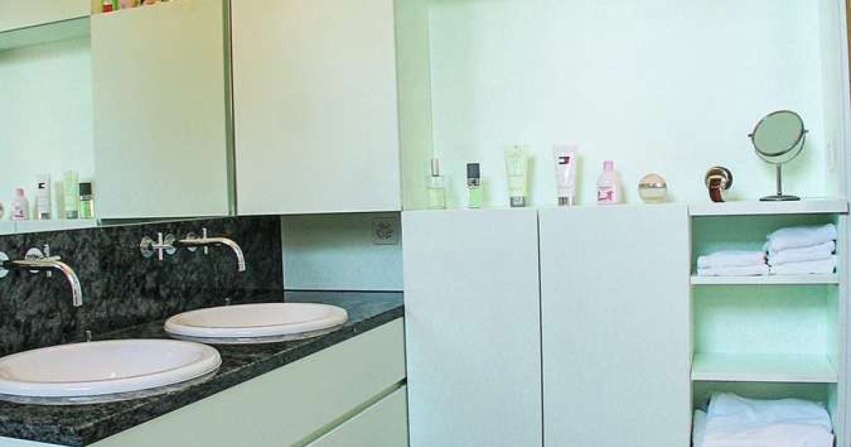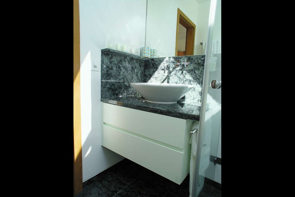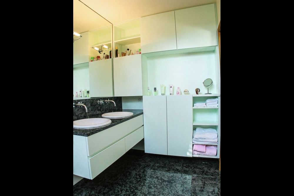 Die sichtbaren Teile wurden aus MDF mit Grundierfolie produziert und anschliessend farbig lackiert. Alle Schubladen sind mit einer Dämpfung und die Türfronten mit Push-to-open-Beschlägen versehen. Die dunklen Abdeckungen und Rückwände sind aus Granit. Die Schreinerei Zwicky aus Aesch BL besteht aus neun Mitarbeitern und fertigt neben Badezimmern auch Türen, Fenster, Schränke, Küchen, Innenausbauten und Möbel nach Mass.