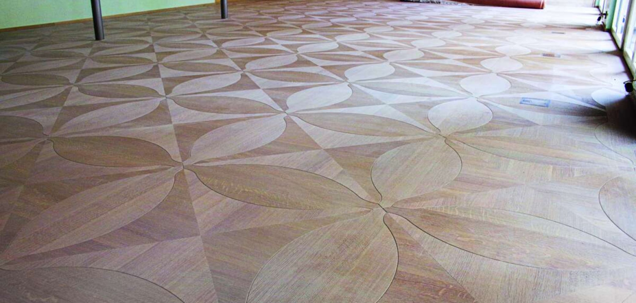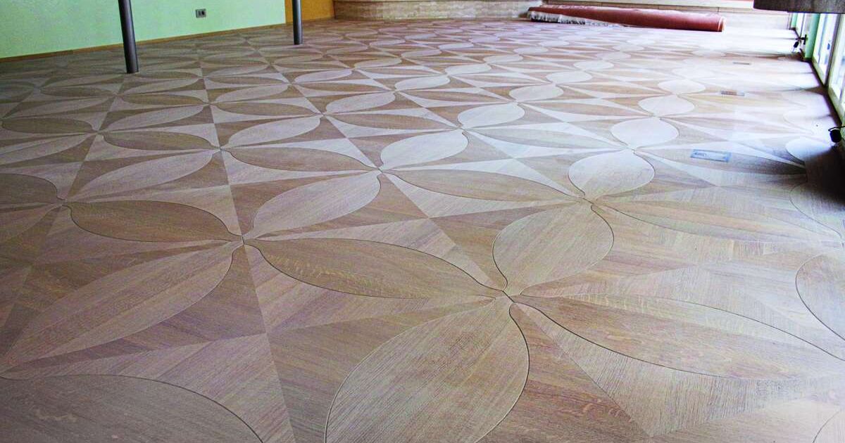 Durch das Zusammenfügen von vier Platten mit eingelegter Ellipse entsteht ein vierblättriges Kleeblatt. Bild: Schmid Parkett AG