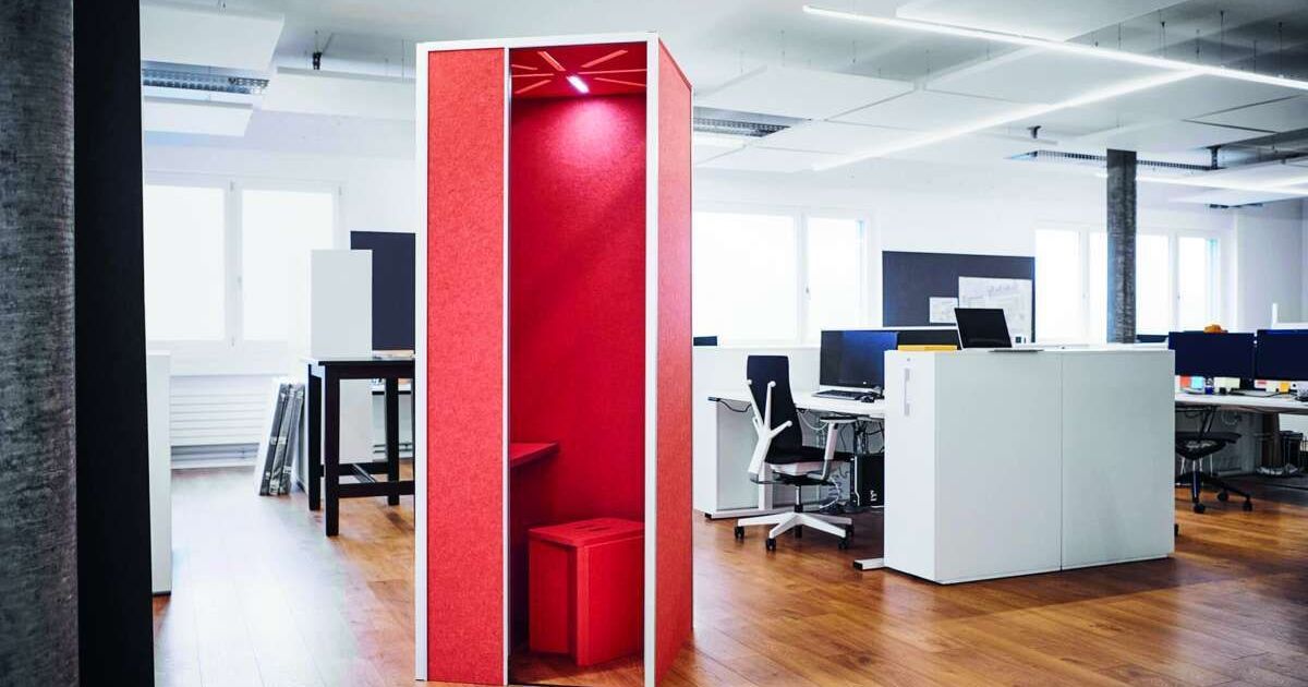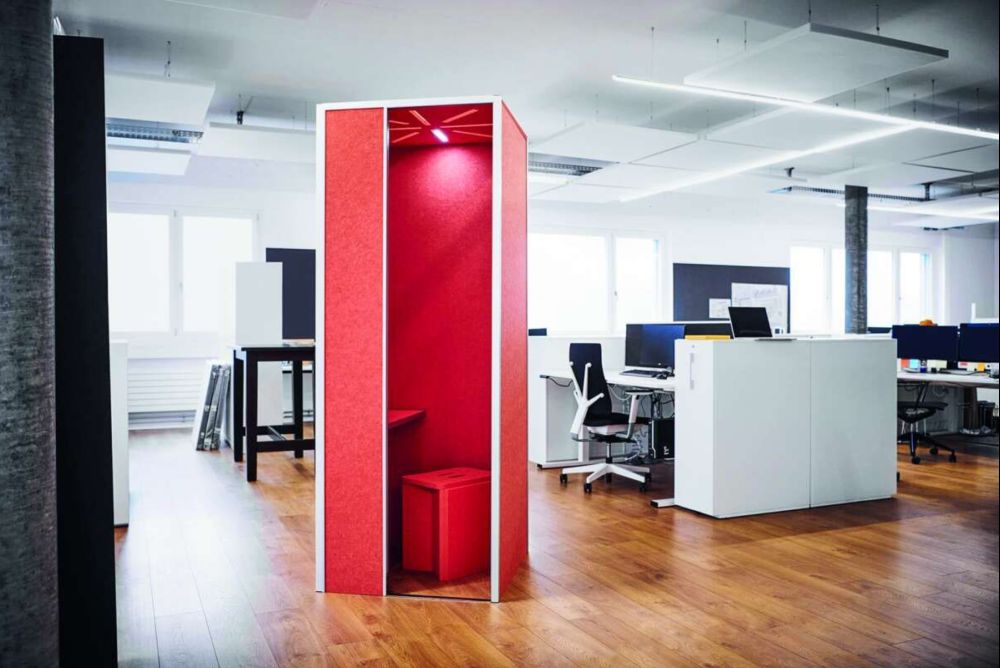 Moderne Büroräume sind offen und kollaborativ. Damit sich die Mitarbeiter wohlfühlen, muss aber die Akustik angenehm sein. Mit der «Echobox by Syma» von Echojazz will man diesen Anforderungen entsprechen. Sie bietet Rückzugsmöglichkeiten für Telefonate oder Videokonferenzen. Und weil moderne Büro- räume flexibel sind, ist die «Echobox» mit wenigen Handgriffen und ohne Werkzeug auf- und abgebaut. Die Sprechkabine hat ein höhenverstellbares Tablar und einen klappbaren Hocker. Beim Hochleistungsabsorber «Echoboard» von Echojazz aus 24 mm dickem Filz stehen 21 Farben zur Auswahl, beim Aluminiumrahmen von Syma sind es drei verschiedene Farben. Die sieben Teile verfügen über werkzeuglose Magnetverbindungen, welche die Kompetenzen beider Firmen vereinen. Die Gesprächskabine wiegt 42 kg. «Echoboard» besteht aus 100 % PET mit einem Recycling-Anteil von mindestens 74 PET-Flaschen pro Quadratmeter. Es ist kreislauffähig, wird zurückgenommen und zu «Echoflakes» verarbeitet.