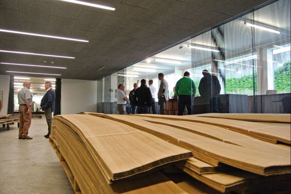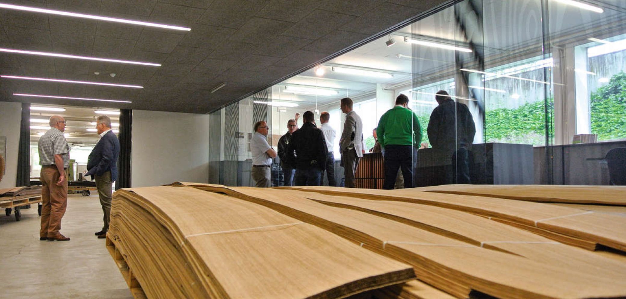 Schon während des Eintreffens im Furnierlager entwickelten sich die ersten vertieften Fachgespräche. Durch diesen Austausch waren alle Teilnehmer sofort in ihrem Element und versammelten sich in kleinen Gruppen vor den einzelnen Furnierstapeln. Als alle eingetroffen waren, ging es in den neuen Muster- und Konzeptraum. Dieser Raum dient zum Verkauf an Schreiner, Architekten und Kunden. Der offene Raum beinhaltet eine grosse, zentral angelegte Musterbibliothek. «Oft hat der Kunde kein Wissen über die verschiedenen Holzarten und deren Aussehen. Auf diese Weise kann er das Furnier nach den optischen Eigenschaften auswählen», sagt Andreas Manger, Unternehmensleiter der Roser AG. Gegenüber der Musterbibliothek befindet sich eine grosse Magnetwand, an welcher die Furniere zum Vergleich oder zur Zusammenstellung einfach angebracht werden können.