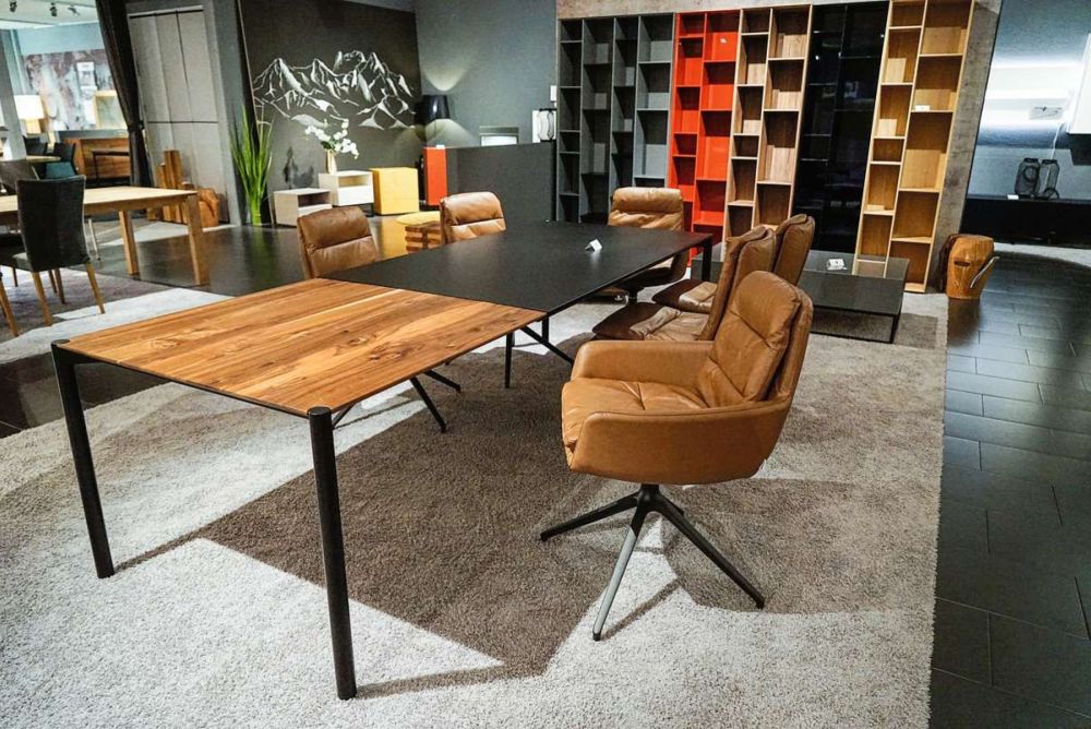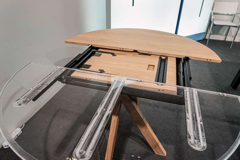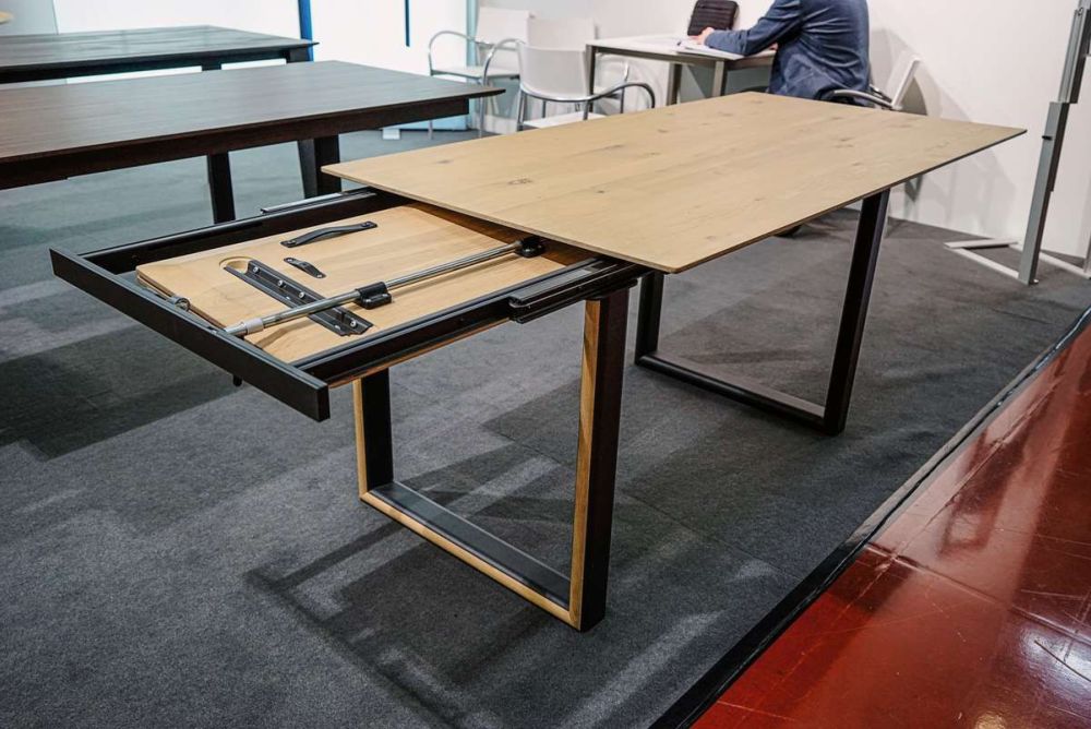 Aktuell gibt es mit Willisau Switzerland in Willisau LU einen Hersteller, der das System mit dem Modell «Diegaro» elegant neu interpretiert und die Elemente gekonnt betont. Die Lüönd Wohncollection aus Rothenthurm SZ nimmt das «Platte-aus-dem Tisch-Ziehen» sogar wörtlich. Sie hat einen Tisch konstruiert, dessen massive Holzhälfte aus der metallenen Hälfte herausgezogen wird. Die gewünschte Länge lässt sich so auf den Millimeter genau einstellen.