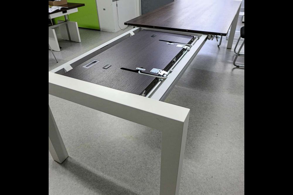 Wie hölzerne Vollauszüge für Schubladen haben schon früh findige Handwerker auch entsprechende Auszüge für Tische gefertigt. Diese wurden unter den Tischhälften befestigt. Ausgezogen, konnten auf ihnen weitere Einlageplatten aufgelegt werden. Den Systemnachteil, dass die Einlagen bei Nichtgebrauch einen guten Lagerort brauchen, hat die IGN Design AG in Sempach LU sinnvoll in Nutzen umgewandelt: Ihr Sitzungstisch-System hat synchron laufende Metallauszüge, die werkzeuglos mit den Untergestellen verbunden werden. Zwei Abschluss- und viele Einlageplatten erlauben es, den Tisch ohne Anstrengung und schnell in der gewünschten Länge aufzubauen. Sogar das vollständige Möbel findet bei Nichtgebrauch auf einem Rollwagen Platz und ist geschützt und frei platzierbar.