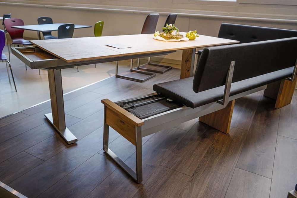 Bei jeder Konstruktion eines Auszugstisches ist es von grundlegender Bedeutung, wo er verlängert werden soll, denn die Zusatzelemente sollen die Tischplatte optisch perfekt ergänzen. Wo nach der Vergrösserung die Tischfüsse sind und ob sie allenfalls mit den Füssen der Benutzer kollidieren, ist ein weiteres Kapitel, wie auch ob der Tisch dann etwas versetzt werden muss. Beispielsweise vergrössert sich ein Tischblatt mit synchron laufenden Auszügen in beide Längsrichtungen, was bei einer Eckbank ein Platzproblem ergibt. Wird ein Tisch verlängert, fehlen dafür sofort Sitzplätze. Die Sitzplatz Schweiz AG aus Wolhusen LU hat die Klappmechanik so weiterentwickelt, dass sogar eine gepolsterte Eckbank verlängert werden kann.