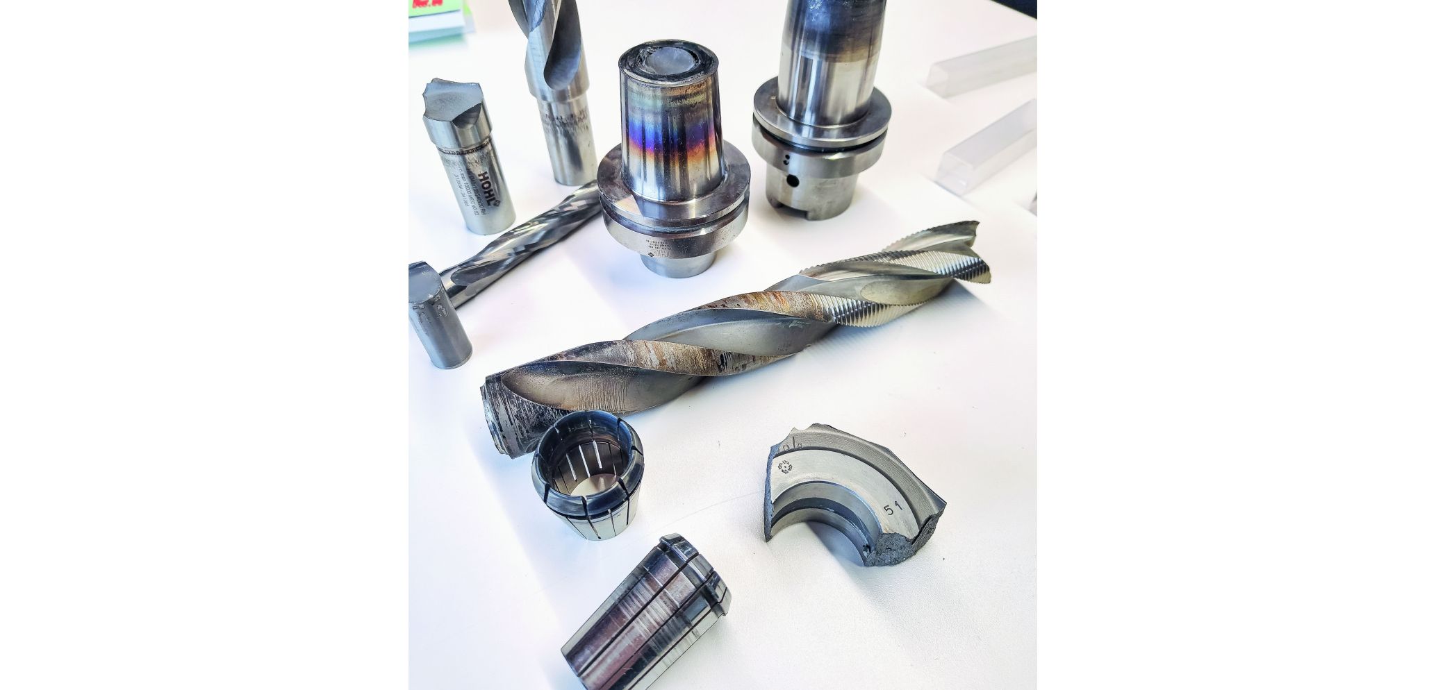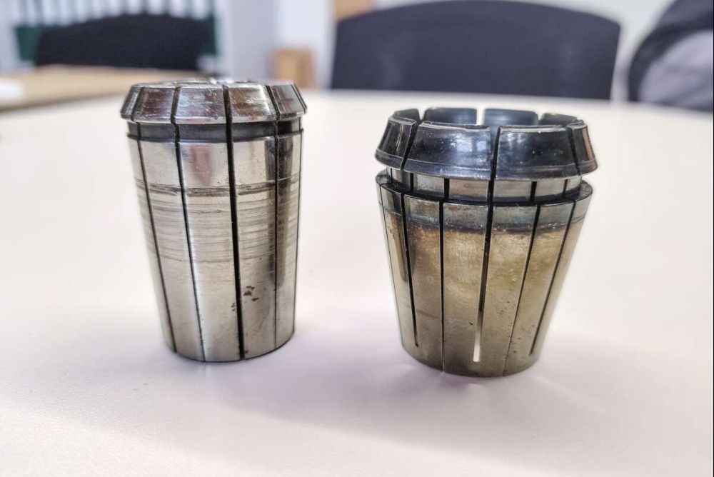 Beim nächsten Einsatz hält die Spannzange den Fräser zwar durchaus noch fest in seiner Position, allerdings kommt es zu Unwucht und Vibrationen. Dies sei meist sehr gut an Vibrationsmarken am Fräserschaft zu erkennen (siehe Bild Mitte links). Auch an der Spannzange zeigen sich solche Spuren. Und durch die Vibrationen unter hohen Drehzahlen können die Flanken am Maul der Zange richtiggehend ausleiern. In solchen Fällen sollte die Spannzange zwingend ersetzt werden – der Präzision, aber auch der Sicherheit zuliebe.