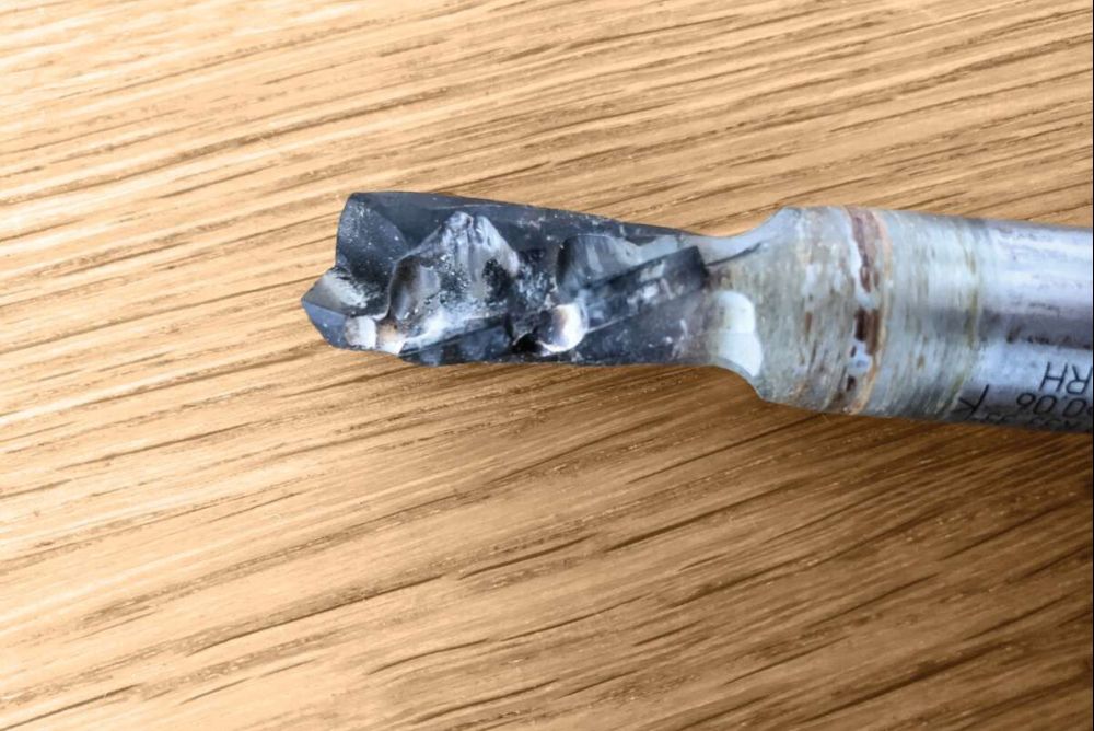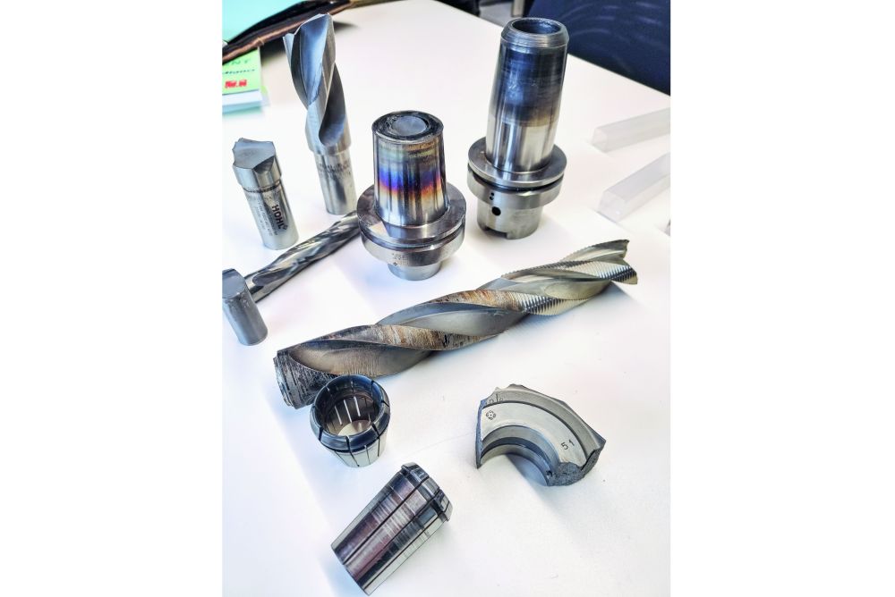 Von Glück sprechen, dass nicht Schlimmeres passiert ist, kann man definitiv auch in einem anderen Fall, mit welchem sich das Unternehmen aus Lenzburg konfrontiert sah. So wurde der DIA-Fräser (Bild unten rechts) klar mit zu hoher Drehzahl und/oder zu tiefem Vorschub eingesetzt, worauf das zu bearbeitende Material zu brennen anfing. «Die falschen Parameter haben dazu geführt, dass auch hier keine sauberen Späne mehr produziert werden konnten, der Fräser überhitzte und stark Schmutz aufgebaut wurde», sagt Zvar. Die dadurch abgestumpften Schneiden haben einen hohen Reibungseffekt zur Folge, was schliesslich zum Brand führte.