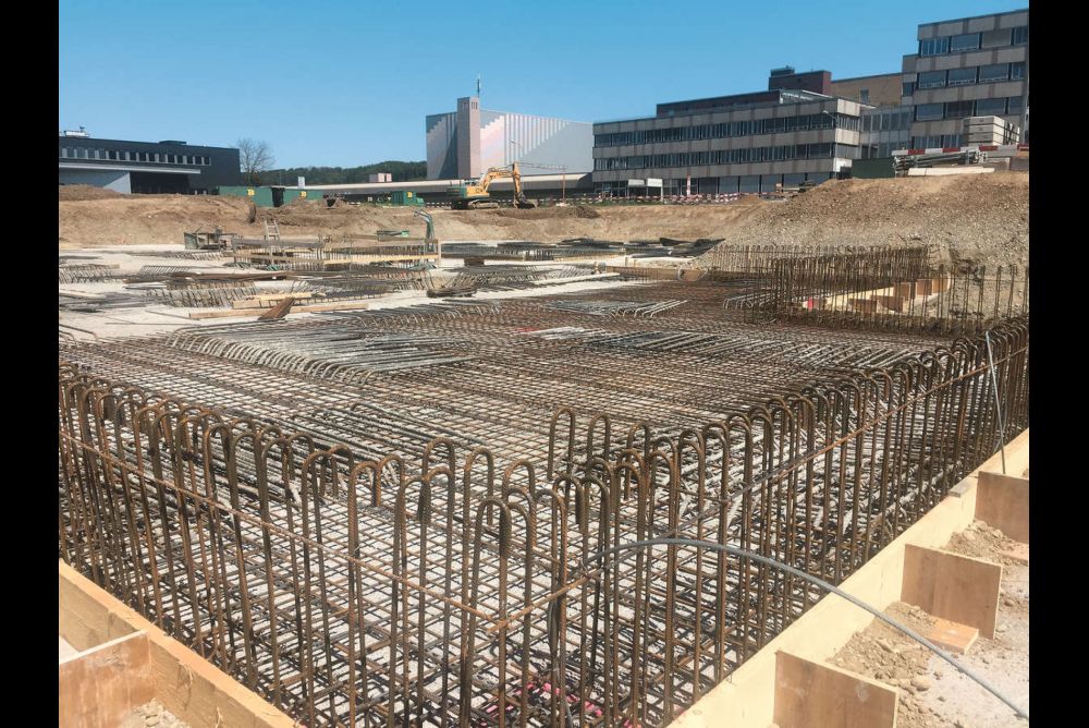 Im Anschluss konnte die komplette Bodenplatte im Keller ausgegossen werden. Für die Armierung der 1000 Millimeter hohen Fundamentanker und der 400 Millimeter dicken Bodenplatte im Keller, die Kellerwände und die 450 Millimeter dicke Bodenplatte im Erdgeschoss wurden ganze 680 Tonnen Eisen verbaut. Dies entspricht etwa 25 vollen 40-Tonnen-LKWs voll mit Armierungseisen.