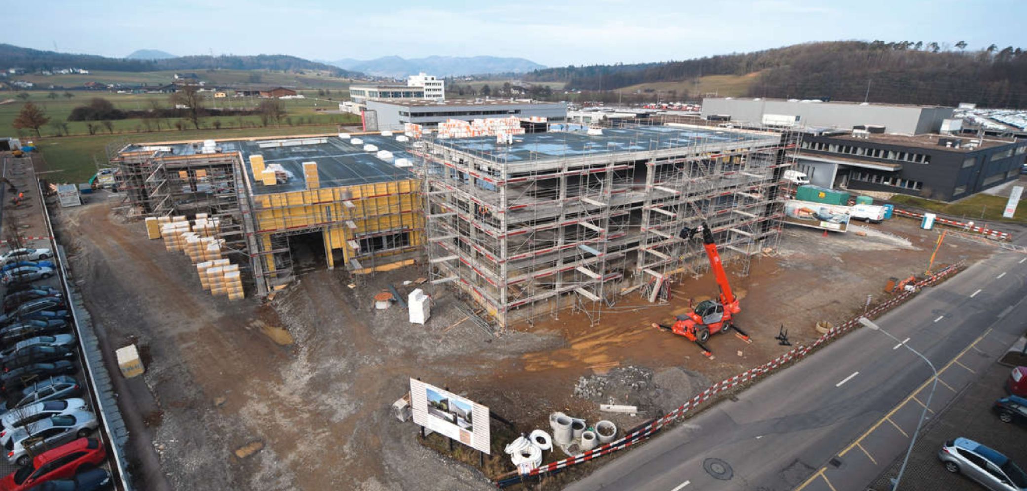 Neubau einer Schreinerei. Die erste Bauphase ist nun abgeschlossen – der Aushub, das Fundament, die Aufbauten und das Dach der Killer Ladenbau AG stehen. Bis es so weit war, gab es einige Herausforderungen und spektakuläre Bauabschnitte zu meistern.