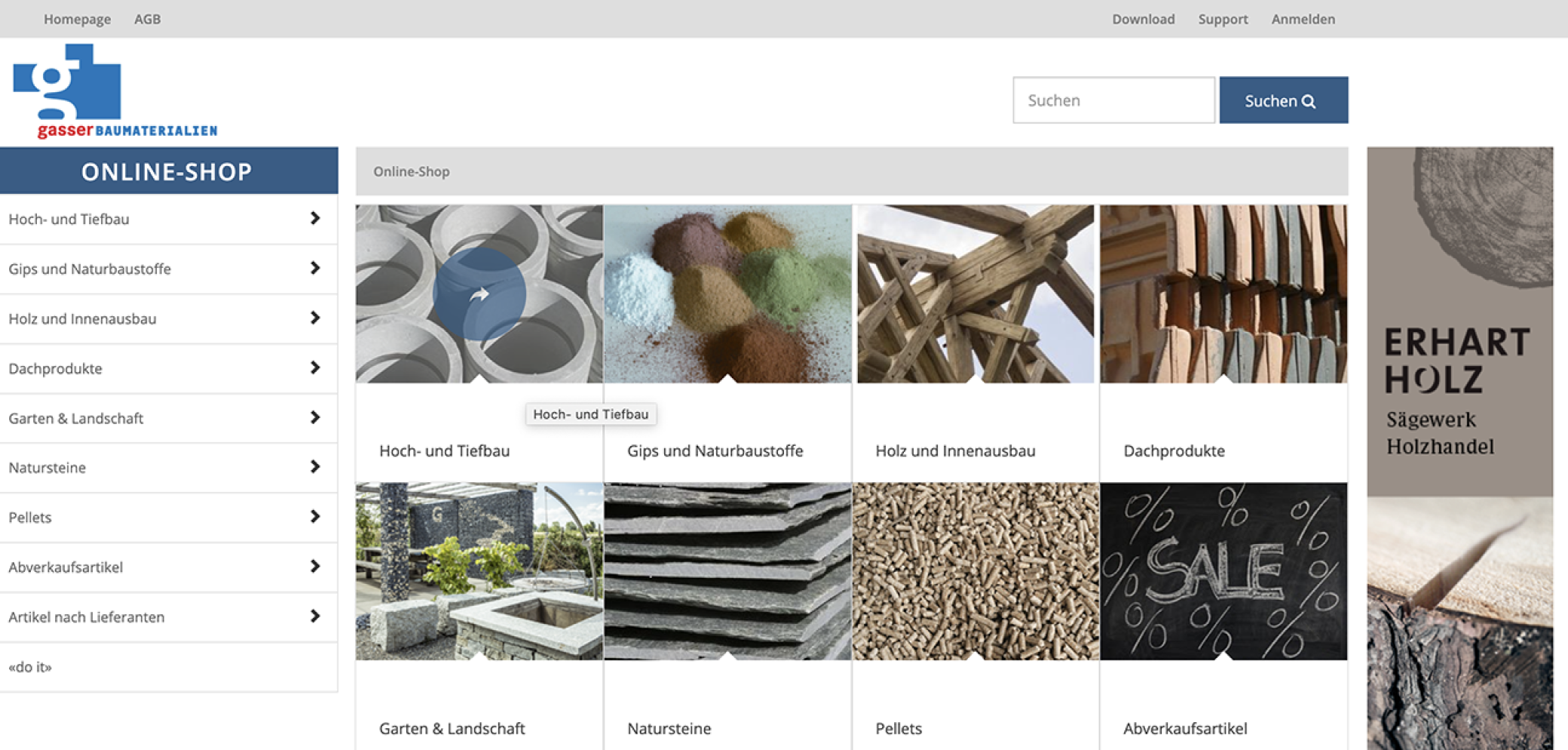 Das Produktsortiment des Webshops von Gasser ist übersichtlich sortiert, so dass sich jeder Handwerker schnell zurecht findet. Screenshot: Christian Härtel