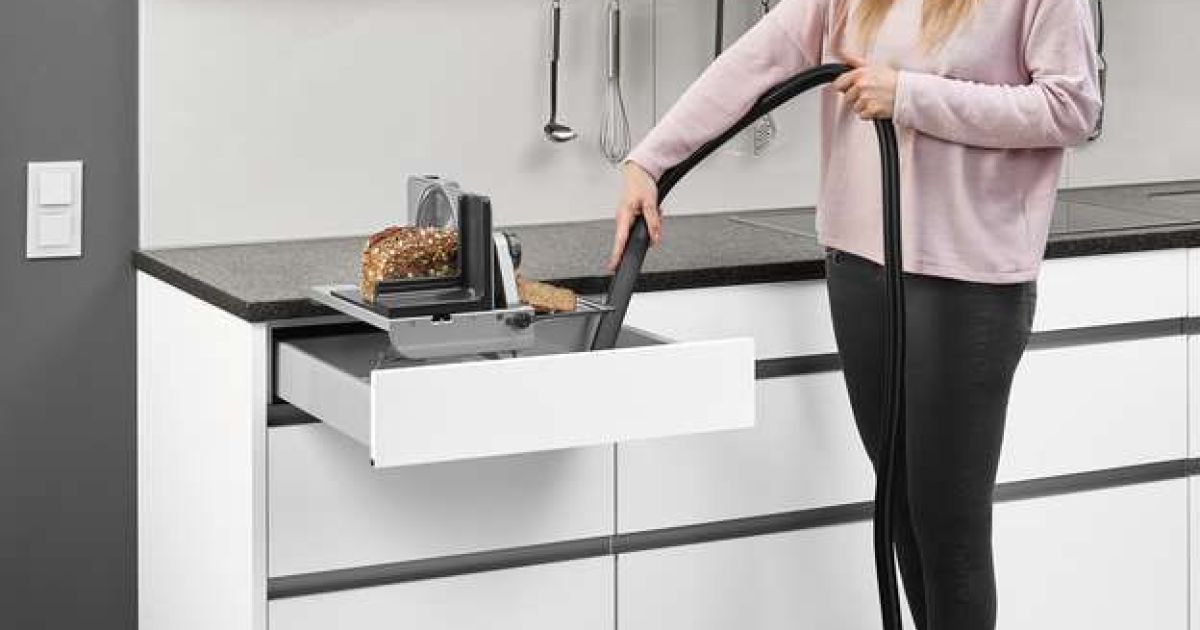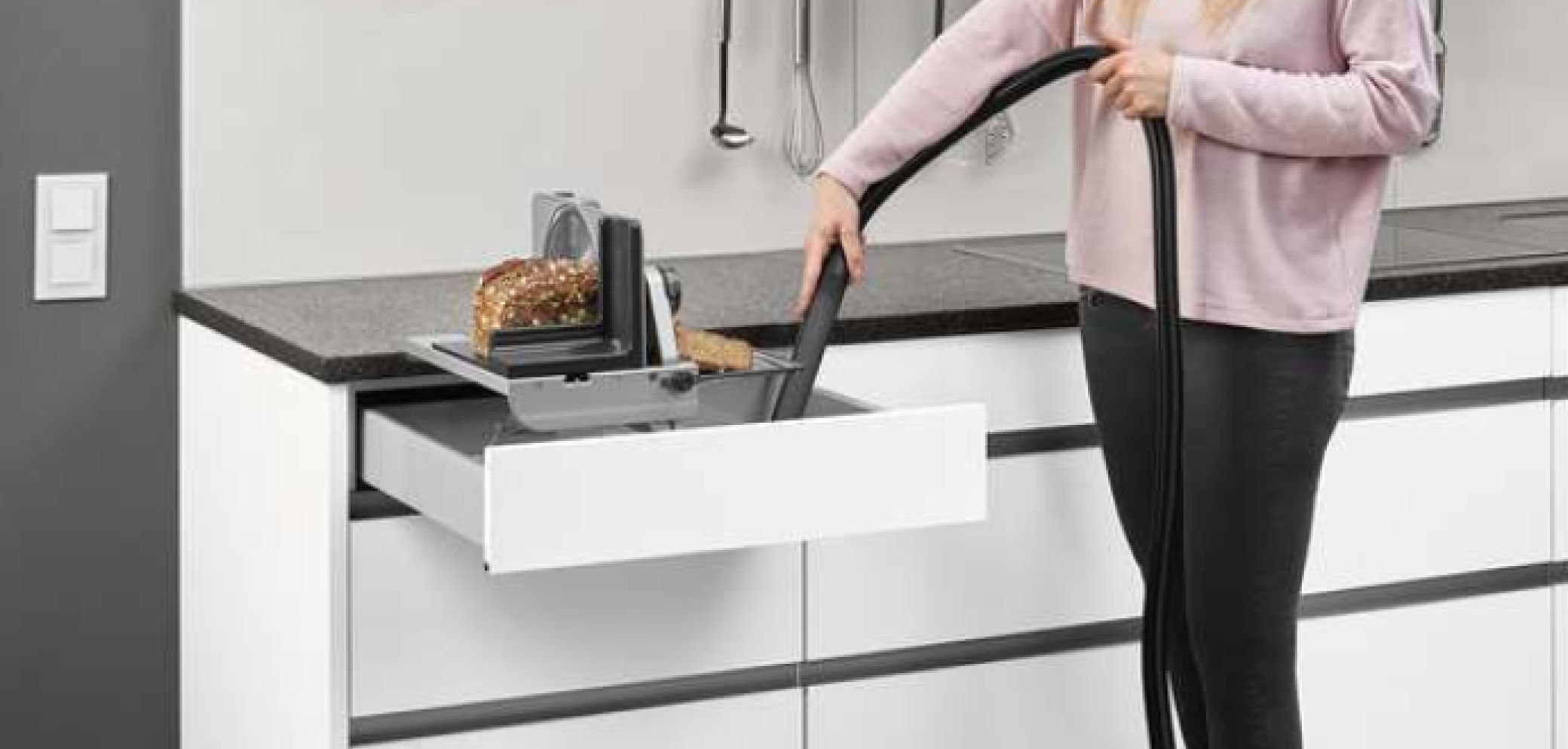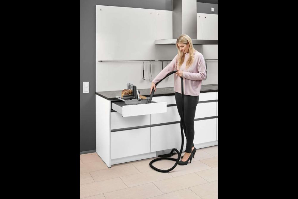 Mit dem Einbau-Sockelsauger «SES 10» ersetzt Ritterwerk den umständlichen Einsatz eines handelsüblichen Staubsaugers auf besonders effiziente Art und Weise. Das schubladengrosse Einbaugerät kann unmittelbar dort montiert werden, wo in der Wohnung am meisten Schmutz anfällt – in der Küche. Krümel und Staub werden einfach davor gekehrt, der Edelstahlknopf wird kurz mit der Fussspitze angetippt – und schon ist der Sauger aktiviert. Mit der geringen Bauhöhe von 105 mm lässt sich das Gerät auch nachträglich in fast jede Küche integrieren. Alles, was benötigt wird, ist ein Ausschnitt in der Sockelleiste und ein normaler 230-Volt-Stromanschluss. Erhältlich ist zudem ein andockbarer Schlauch mit Handdüse.