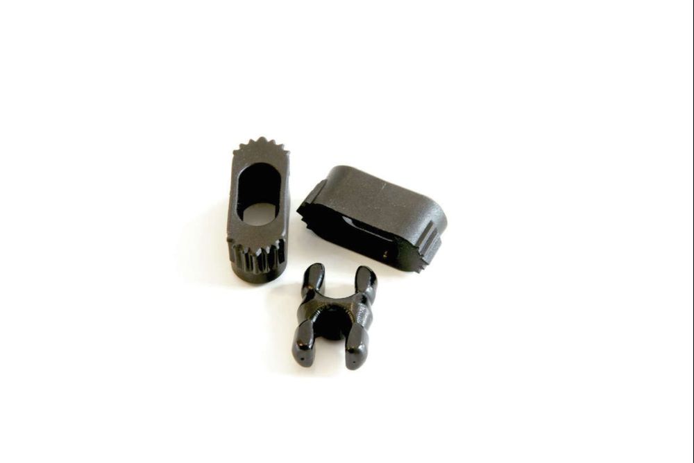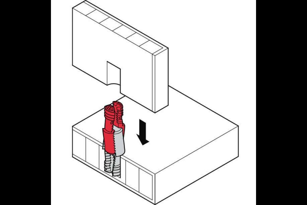 Der Kunststoffdübel mit seiner speziellen H-Form wird dann beim Korpuszusammenbau in eine der Hülsen gedrückt. Beim Zusammenklopfen der beiden Werkstücke entsteht eine «schnappende» Verbindung, wodurch es zu einer Fixierung in alle Richtungen kommt. Somit werden keinerlei Spannwerkzeuge mehr benötigt.