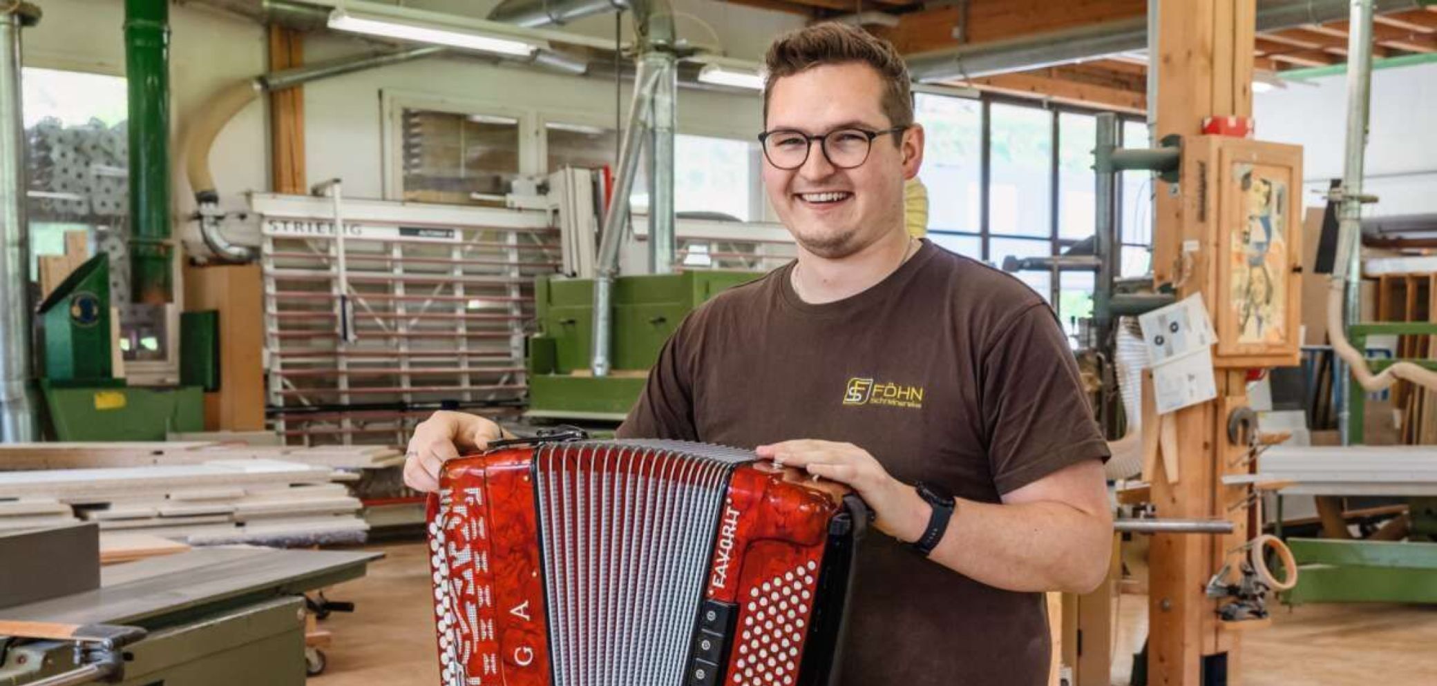 Die Liebe zur Musik liegt in der Familie: «Ungefähr mit fünf Jahren hatte ich zum ersten Mal eine Handorgel in der Hand», sagt der Unteriberger im Büro der Schreinerei. Inspiriert hat ihn sein älterer Bruder Simon, der schon länger musiziert habe. Zu seinen musikalischen Geschwistern gehören die jüngeren Schwestern Alisha und Shanja. Alisha spielt Klavier, Shanja Alphorn und Trompete. Der Vater jodelt in der Trachtenjodlergruppe und zieht ab und zu am Bass, die Mutter hat früher Panflöte gespielt. «Auch die Wahl meines Berufes fiel mir nicht schwer», sagt Reichmuth. Denn Vater Peter ist ebenfalls Schreiner und arbeitet im Betrieb. «Während der Schulzeit sprang ich an Mittwochnachmittagen gern ein und half mit», erzählt der 23-Jährige, und man sieht ihm seine Freude am Beruf an. Nach der vierjährigen Lehre in Oberiberg machte er einen Abstecher nach Altendorf, wo er zwei Jahre in einem Betrieb mit CNC-Maschinen arbeitete. An seinem Beruf mag er nebst der Vielseitigkeit die Genauigkeit. «Ich arbeite gerne mit den Händen und finde es schön, dass ich am Abend sehe, was ich gemacht habe.» Nebst dem Handwerklichen liege ihm aber auch das Planen: Noch bis im Herbst dauert seine Weiterbildung zum Projektleiter. Mit seinen jungen 23 Jahren ist er bereits Geschäftsführer von drei Mitarbeitenden und einem Lernenden. «Dazu brauchte es anfangs etwas Mut, und es war auch ein bisschen ein Sprung ins kalte Wasser.» Aber er habe es keine Minute bereut.