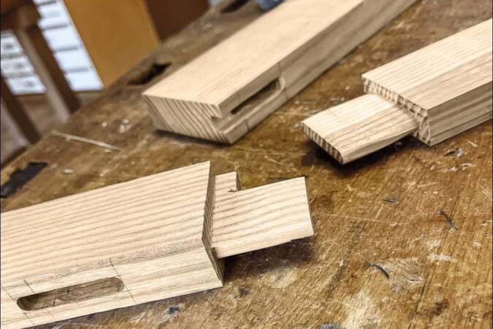 Wir benutzten Tischfräse, Langlochbohrmaschine, Handoberfräse, Akkuschrauber, Abricht- und Dickenhobelmaschine sowie die Bandsäge.