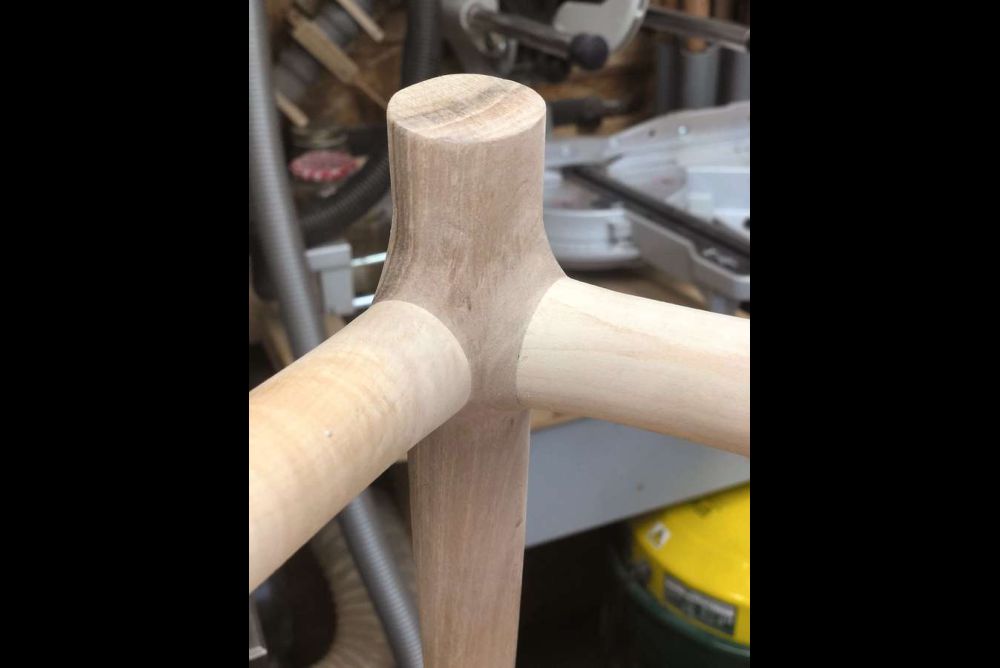 Die Idee war, mit Drechseln eine Tragkonstruktion für einen Stuhl oder Tisch zu gestalten. «Die Einzelteile habe ich mit einer stabilen Verzapfung, dem Dominosystem von Festool, verbunden. Ich habe sie zusätzlich verstärkt, indem ich die Übergänge geschnitzt habe.» Fliessende und weiche Formen seien ihr wichtig gewesen. Denn die Konstruktion soll nicht nur dem Auge, sondern auch den Händen des Besitzers schmeicheln.