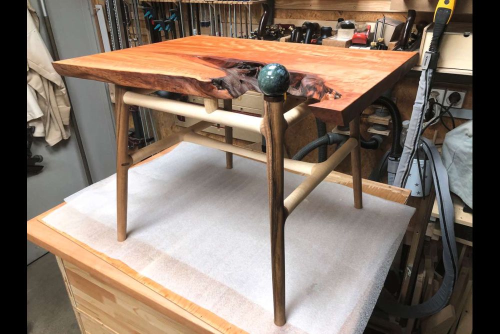 Für das oben frei endende Tischbein hat sich Chaska Schuler noch etwas Besonderes einfallen lassen: «Ich habe einen Aufsatz aus Ebenholz gedrechselt, um darauf eine schöne Kugel zu stellen. Das sieht super aus.»
