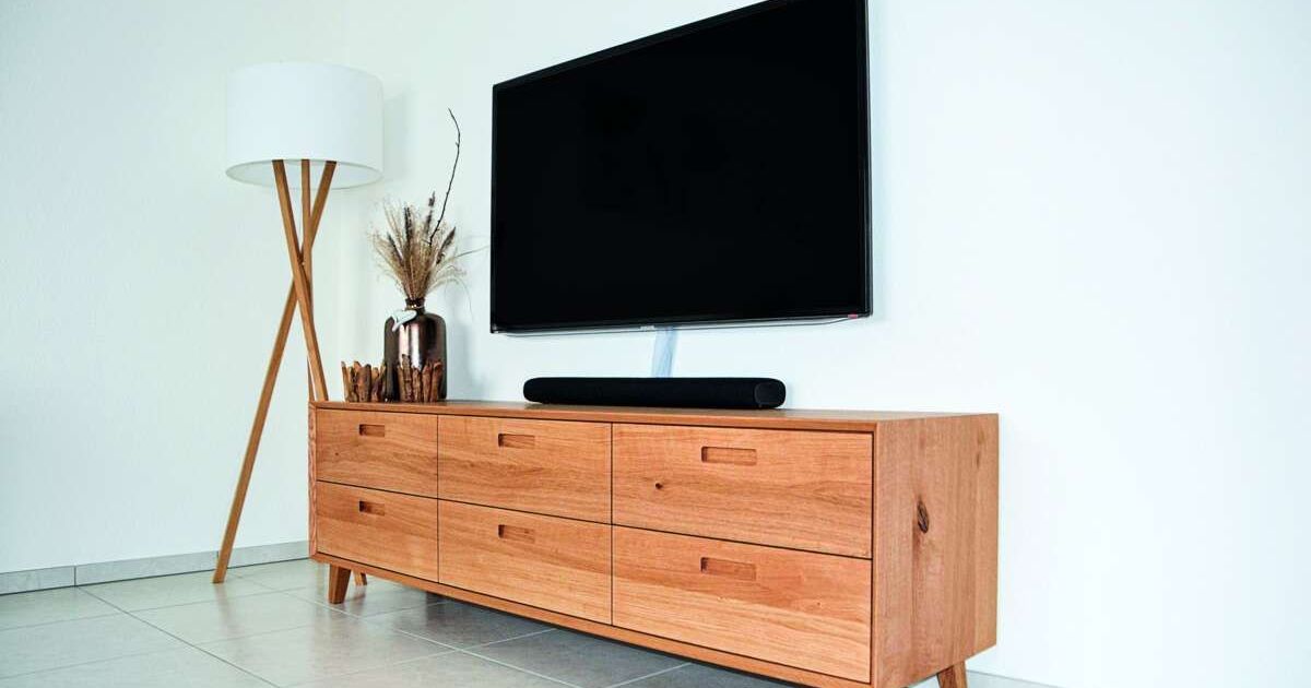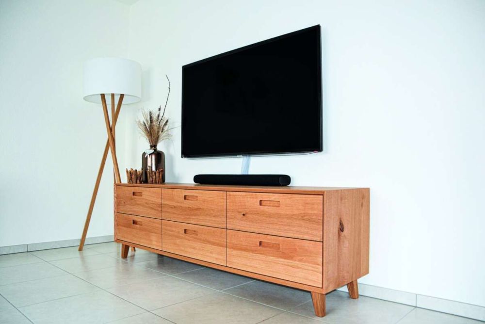 Das TV-Möbel aus Eichenmassivholz steht nun im Wohnzimmer von René Kühne. Bild: René Kühne