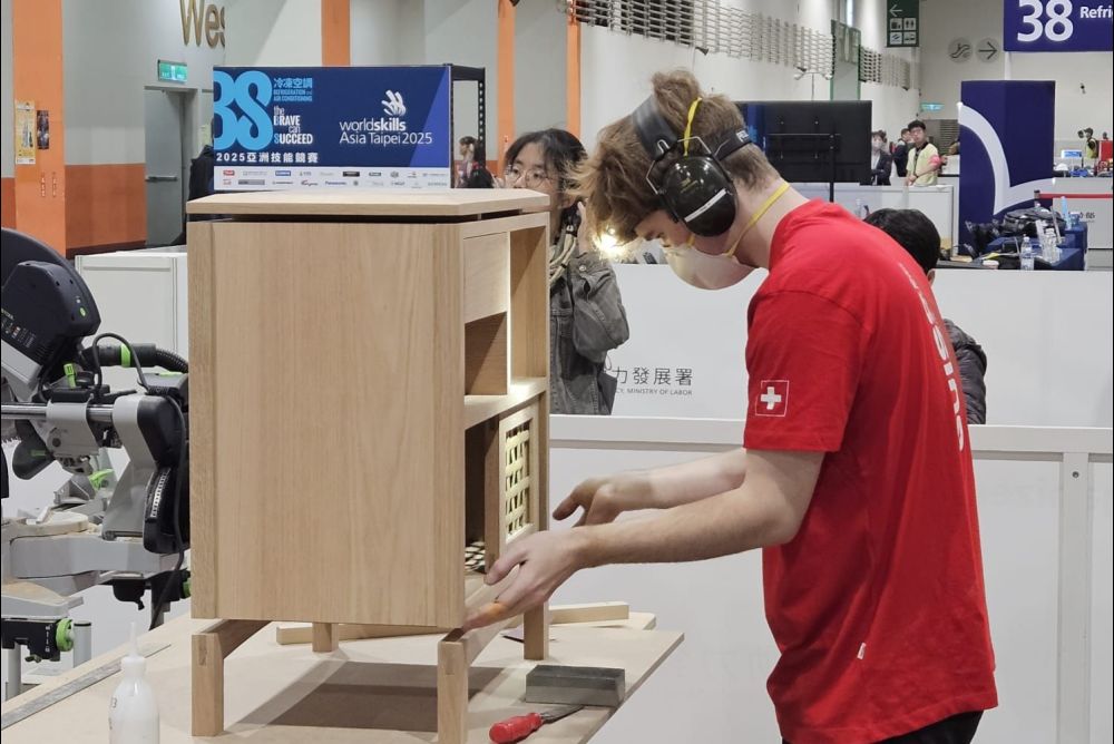 Sozusagen als erstes Training ist der Schweizermeister der Möbelschreiner, Silvan Reichen, mit seinem Experten Tobias Hugentobler nach Taiwan geflogen, um an den World Skills Asia 2025 teilzunehmen. Dort hat er erste Erfahrungen im internationalen Umfeld gesammelt. Im neuen Jahr werden die Vorbereitungen auf die World Skills 2026 in Shanghai intensiviert.