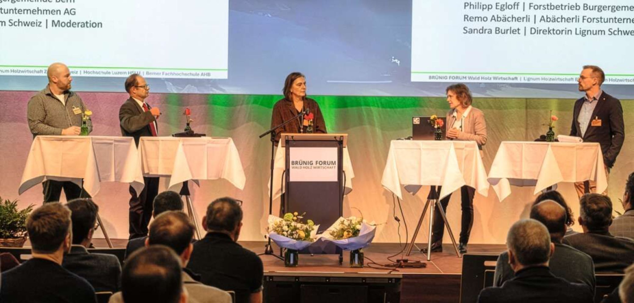 Die Teilnehmenden der Podiumsdiskussion vermissen klare Prioritäten in der neuen Wald- und Holzstrategie 2050 des Bundes. Bild: PD