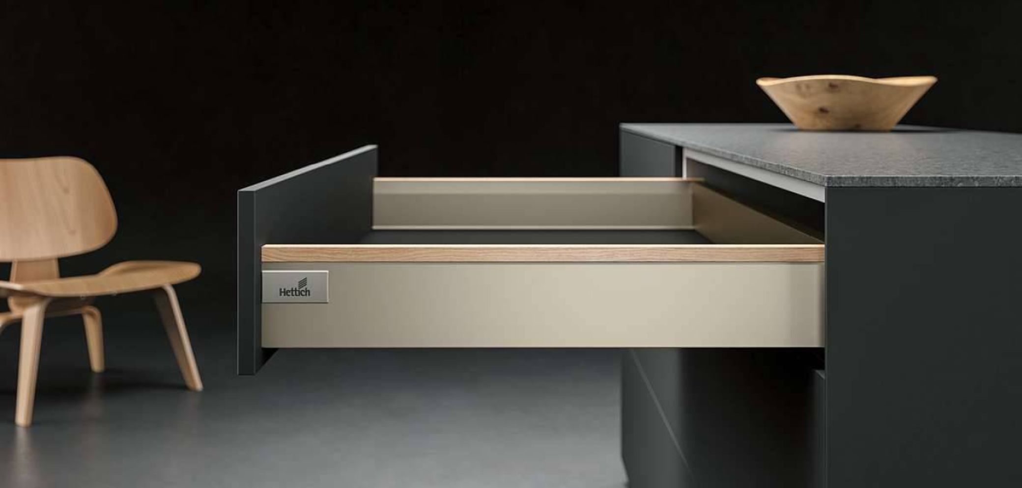 Hettich hat mit den neuen Designprofilen für «ArciTech»- und «InnoTech Atira»-Schubladen eine effektvolle Form der Individualisierung geschaffen. Die dekorativen selbstklebenden Designprofile in Edelstahl-, Chrom- oder Aluminium-Optik verleihen den Schubladen eine besondere Wertigkeit. Eiche- und Nussbaum-Optik greift den Trend zu mehr Natürlichkeit auf. Die Kombinationsmöglichkeiten sind hier so vielfältig wie die Ansprüche der Kunden. Ob im Wohn-, Schlaf-, Küchen- oder Objektbereich – der Mix unterschiedlicher Materialien und dekorativer Designprofile setzt Akzente. Der Produktionsprozess bleibt vollkommen unberührt.