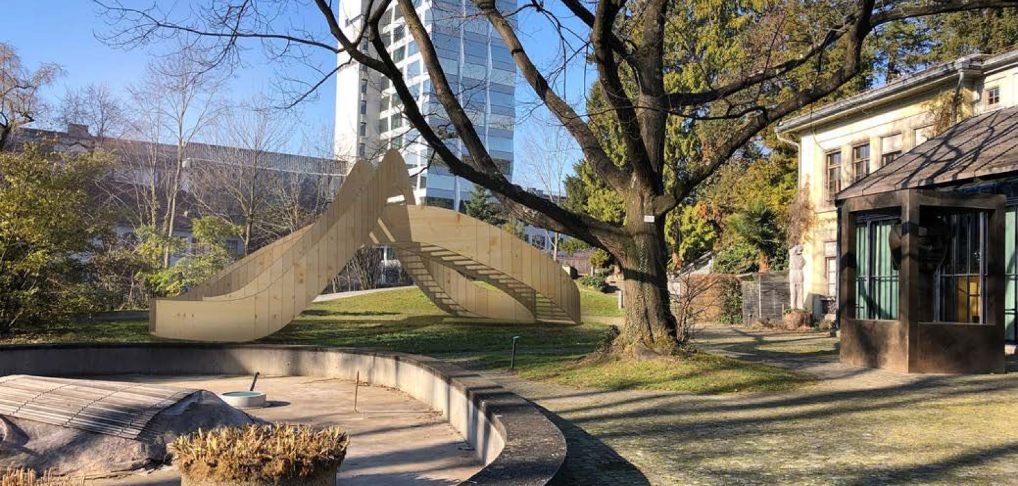 Die zwei begehbaren Brücken, die sich schwebend aufspannen und kreuzen. 3D-Rendering: Hector Egger AG