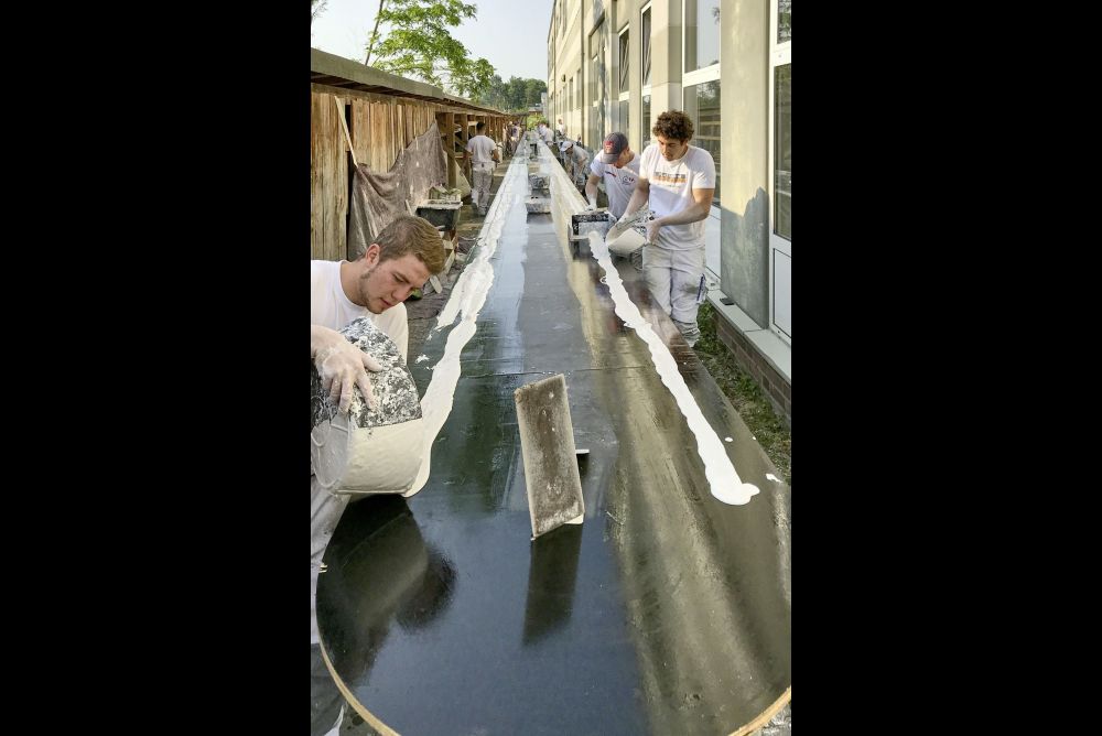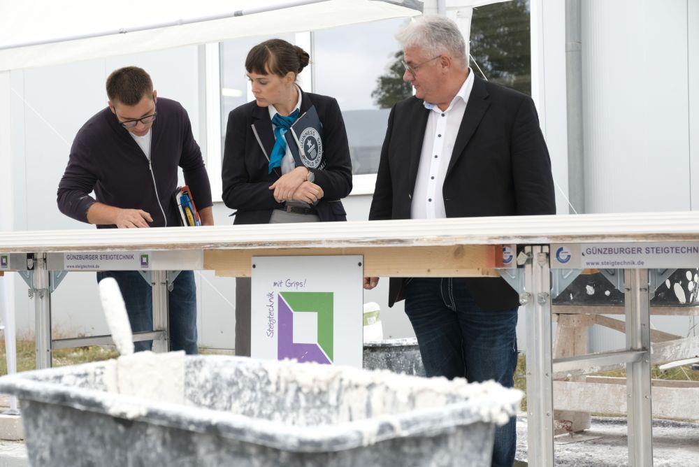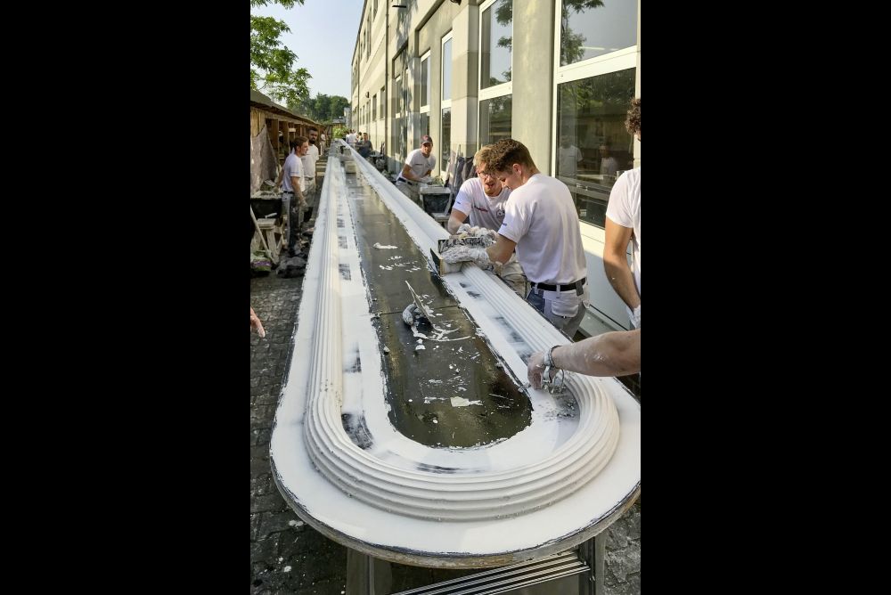 Ironischerweise heisst der Gründer und Leiter des deutschen Nationalteams der Stuckateure Frank Schweizer. In acht Zweierteams hatten die Mitglieder des Nationalteams mit den Auszubildenden des Lehrbauhofs Berlin Hand in Hand zusammengearbeitet.