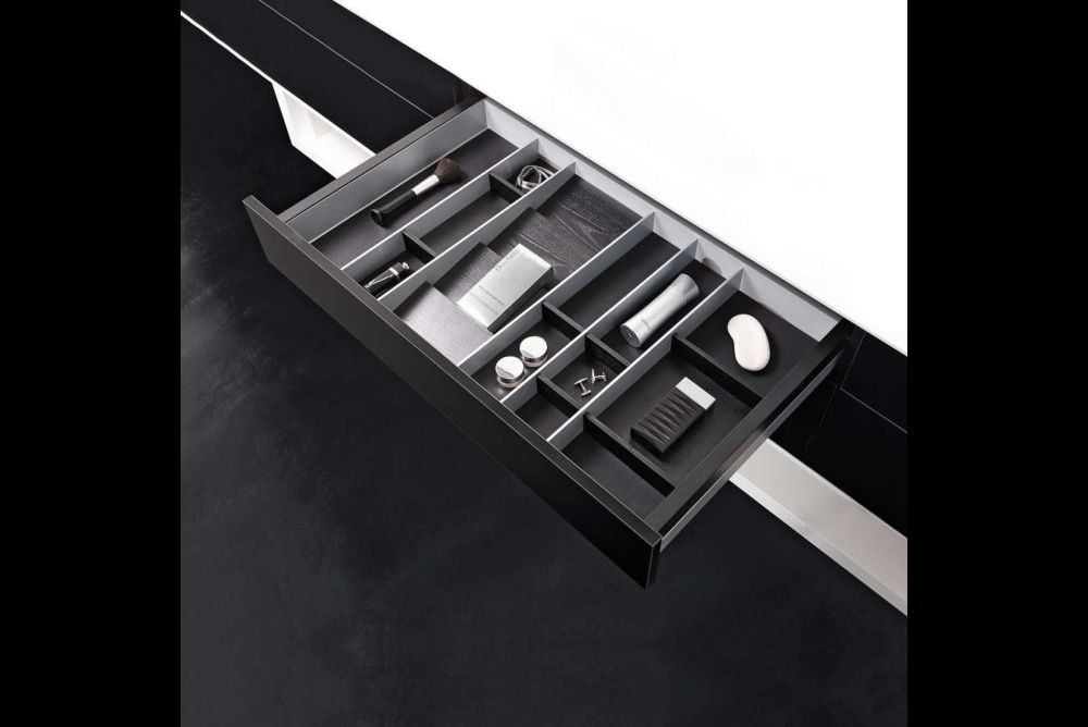 Mit dem Innenausstattungssystem «Tavinea 91» bietet Grass eine Struktur in der Schublade an, die auf einem Rastermass von 91 mm basiert. Wenige Standardelemente ermöglichen eine Vielzahl von Kombinationen und somit eine individuelle Ordnung. Die ästhetisch ansprechende Ausführung mit 4,5 mm schmalen Stegen aus Aluminium und Schlittenelementen aus Echtholz lassen eine vertikale oder sogar diagonale Einteilung zu. Das System verzichtet vollkommen auf platzraubende doppelte Wände. Formfeste samtschwarze Anti-Rutsch-Matten aus pflegeleichtem Elastomer sorgen zudem dafür, dass jeder eingeräumte Gegenstand an dem ihm zugedachten Platz bleibt.