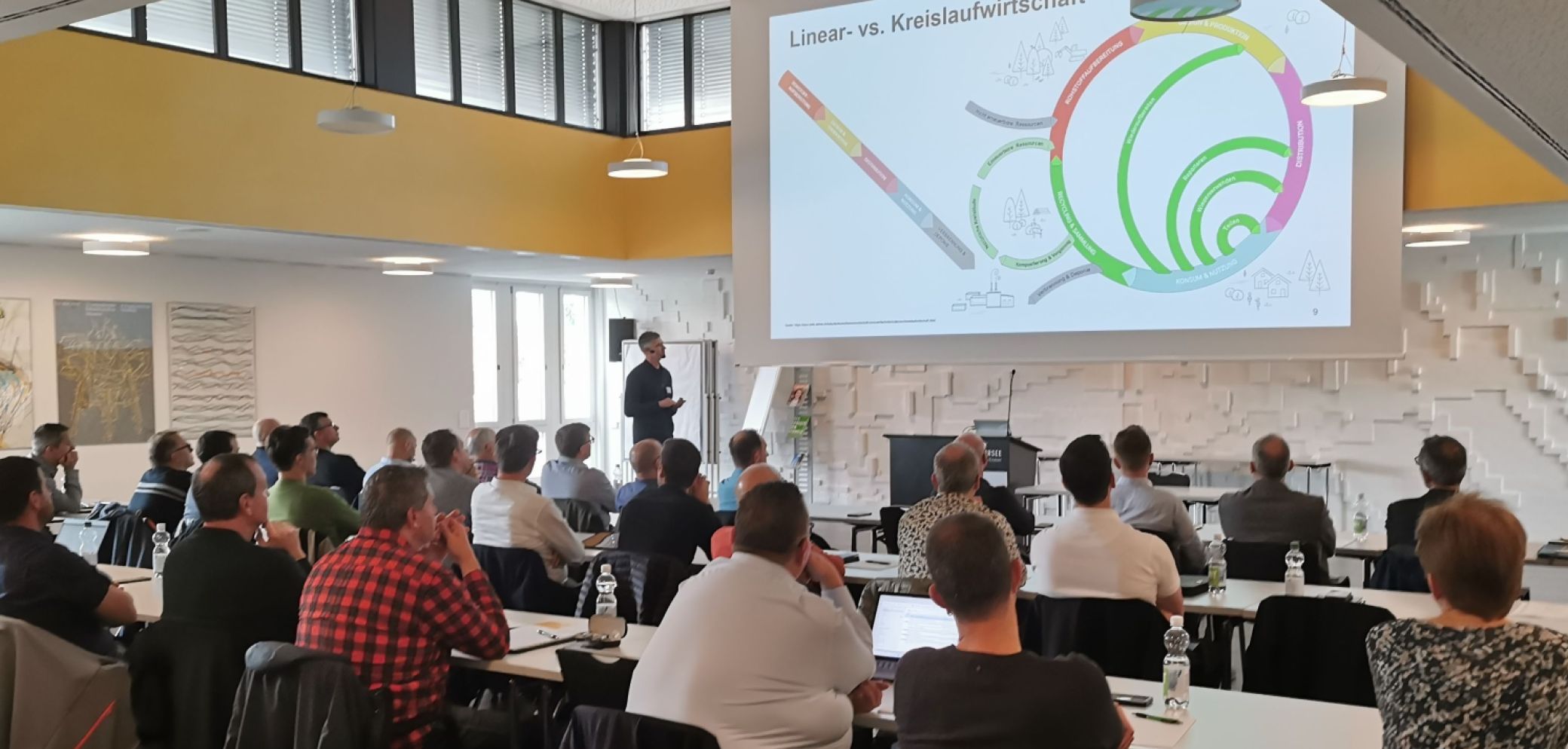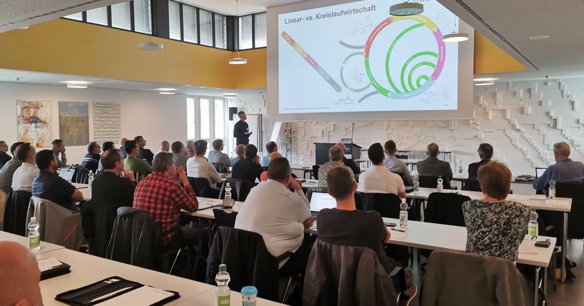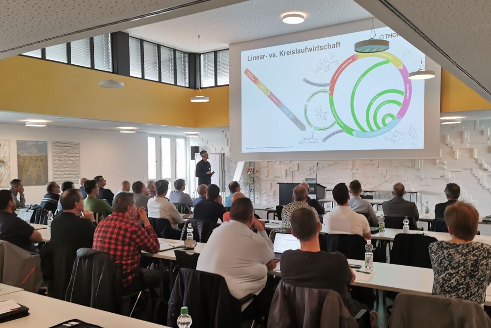 Thomas Ganz von der Thommen AG erklärt den 48 Teilnehmenden, in wie sich Fenster in die Kreislaufwirtschaft einfügen. Bild: Christian Härtel
